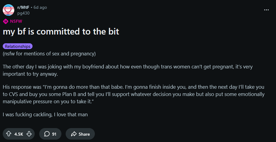 >>41461136THIS, so much this.When I read that tweet the first time, I actually threw up. Like, literally. And now, reading again, I can immediately feel those same feelings come rushing back. Despair, panic, fear.When cis women go through this shit it's certainly not for fucking fun. Many of us are haunted by the memories for the rest of our lives. So to see someone WILLINGLY expose themselves to a simulated situation akin to it?No. Just no. That is so deeply fucking fucked up that I don't even know where to begin.Thank you for letting us know, that we are not alone in this.