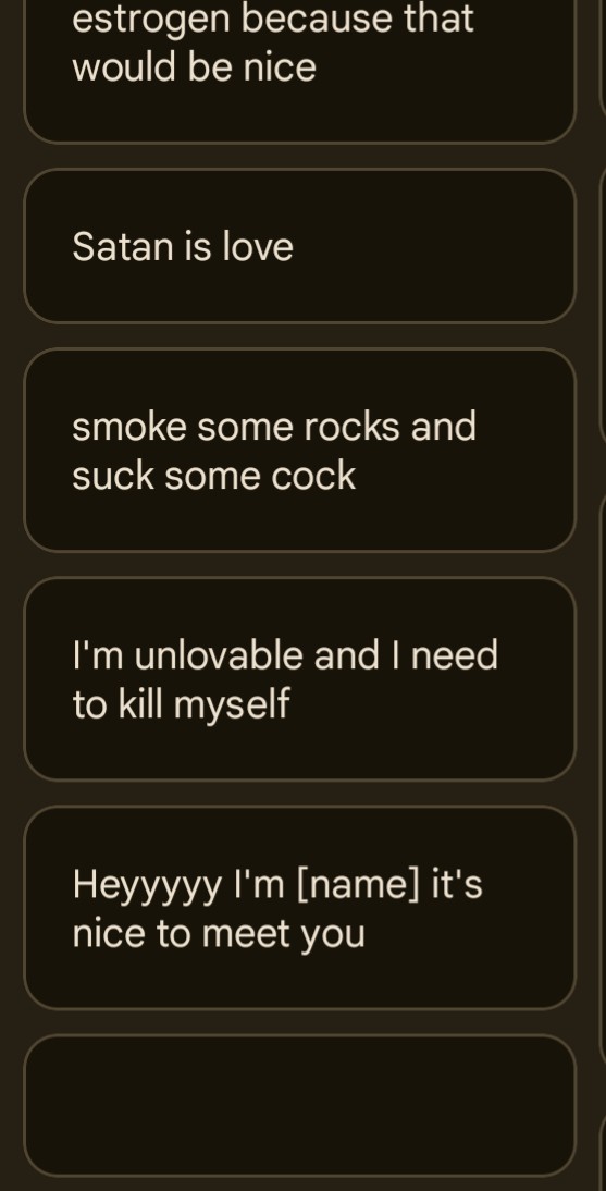 >i have assaulted multiple people >i have serious psychology problems and am a danger to myself and others>i have repeatedly hit women>i have repeatedly broken things in anger >i drink until i throw up>i smoke cigarettes until i throw up>i smoke weed until i throw up>i smoke meth. i eat shrooms. i feel sick>i fantasize about stabbing myself and being stabbed>i masturbate to true crime youtube videos>i masturbate in public restrooms >i masturbate in public parks>i sometimes laugh uncontrollably>i don't understand why>i repeatedly send people hundreds of consecutive text messages >i have no friends >i steal people's clothing and smell it while masturbating >i hate myself and want to die>i am evil i did this>i gotta touch em>i have the sickness >i am smiling and laughing while typing this>i hate trans people and want to kill them >i also want to have sex with them>2 years on estrogen