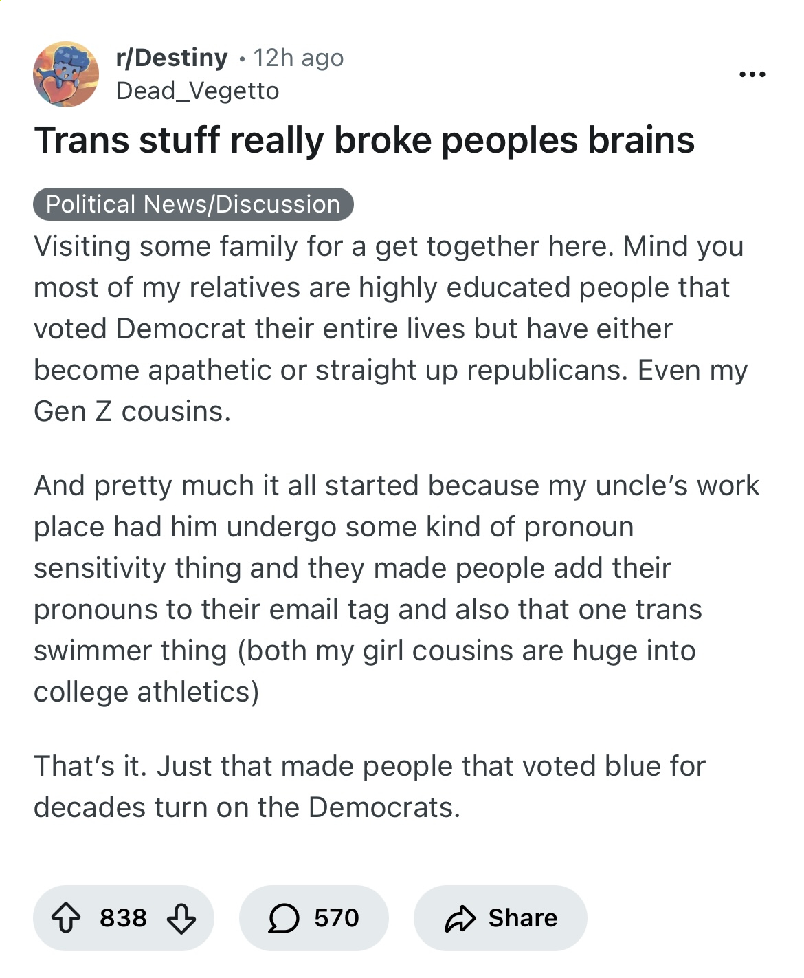 Ever since we stopped fighting wars and dying of smallpox they've been desperate for something to do. The media ragebaiting them into hating trans people is their Black Death. Something to fill their meaningless lives and make them feel badass and battle-hardened until they die.