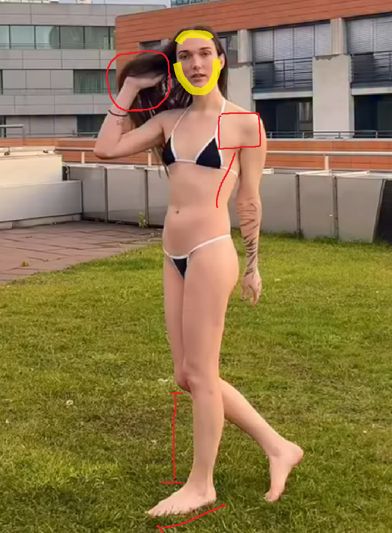 >>41532130>the large empty flat area near the armpits on the pecsThat is the ribcage anon>the expanded outline of the male ribcage flaring out in motion that creates the inverted triangle look, marked by the red line under the red boxThat's called having a ribcage and low body fat anon>expanded facial planes in yellow, AKA an expanded border of the face creating the large skull, small face lookJust say she has a big head>foot to chin ratio>huge hand on tiny wristsYou made these up>carrying angle in a highly bent frameYou're retardedThe answer is much easier - shoulders, lack of curves, lack of tits - but you're trying to be smart, and failing at thatKill yourself