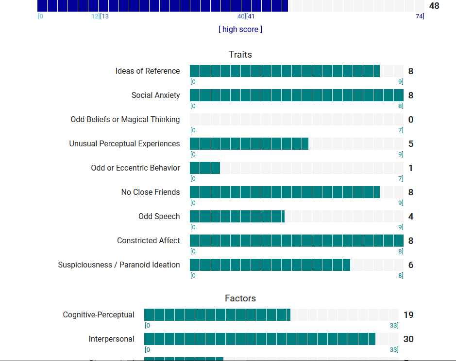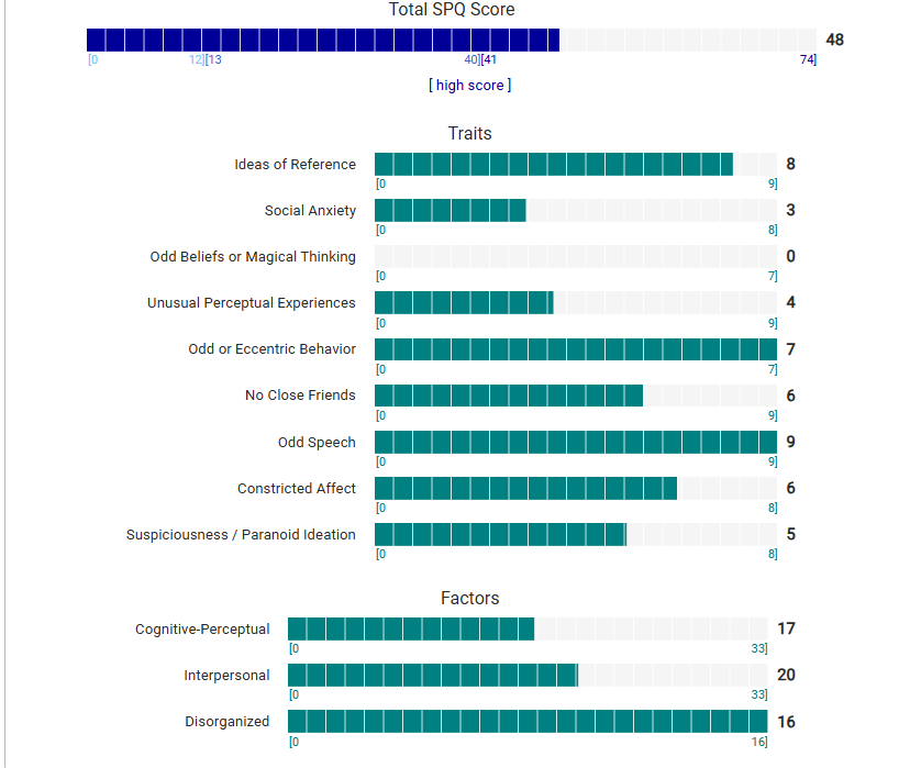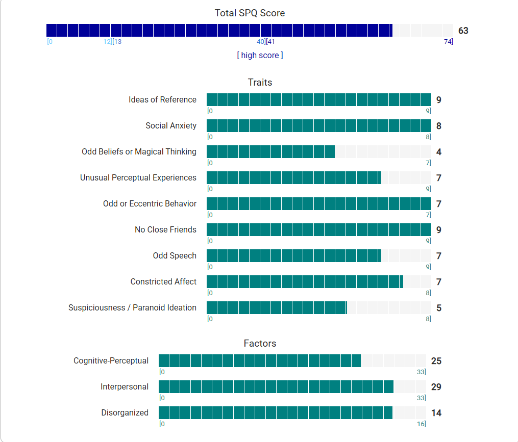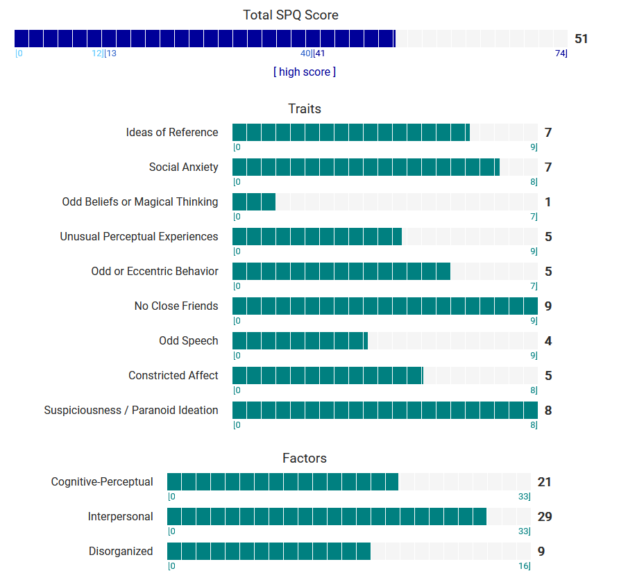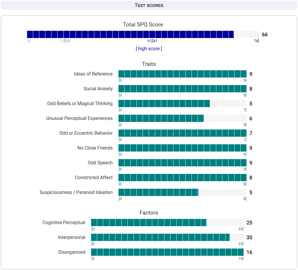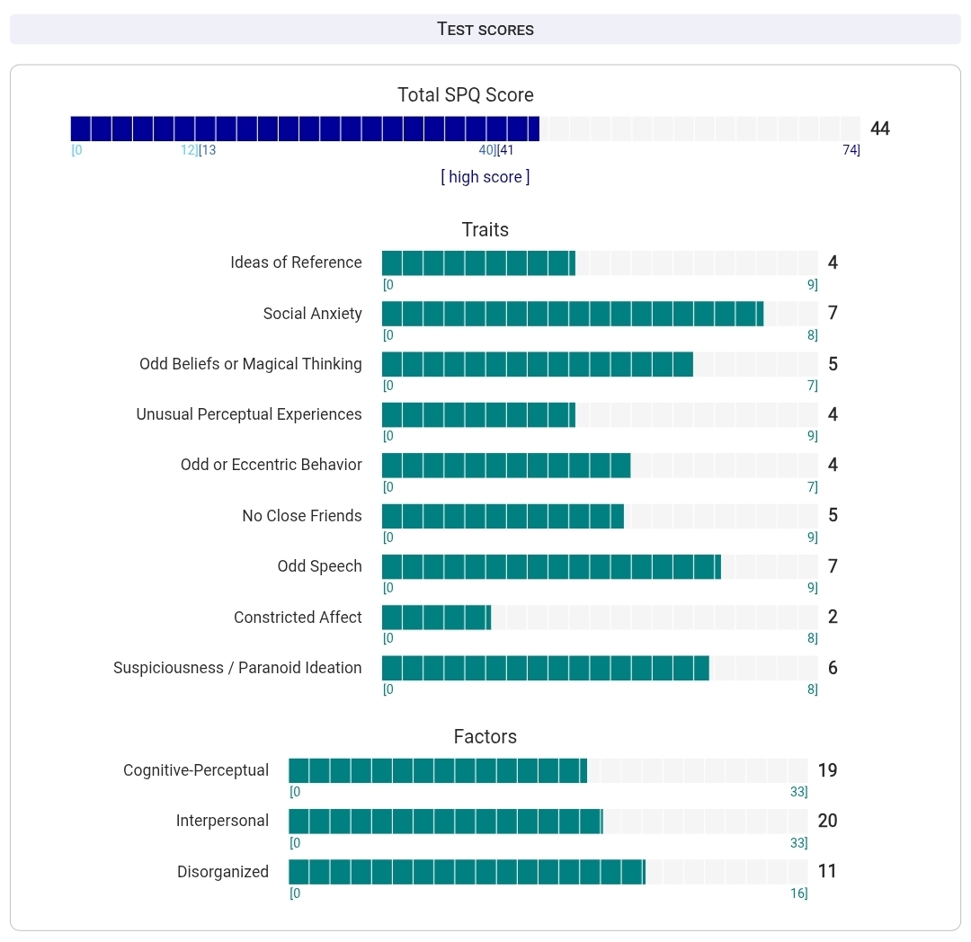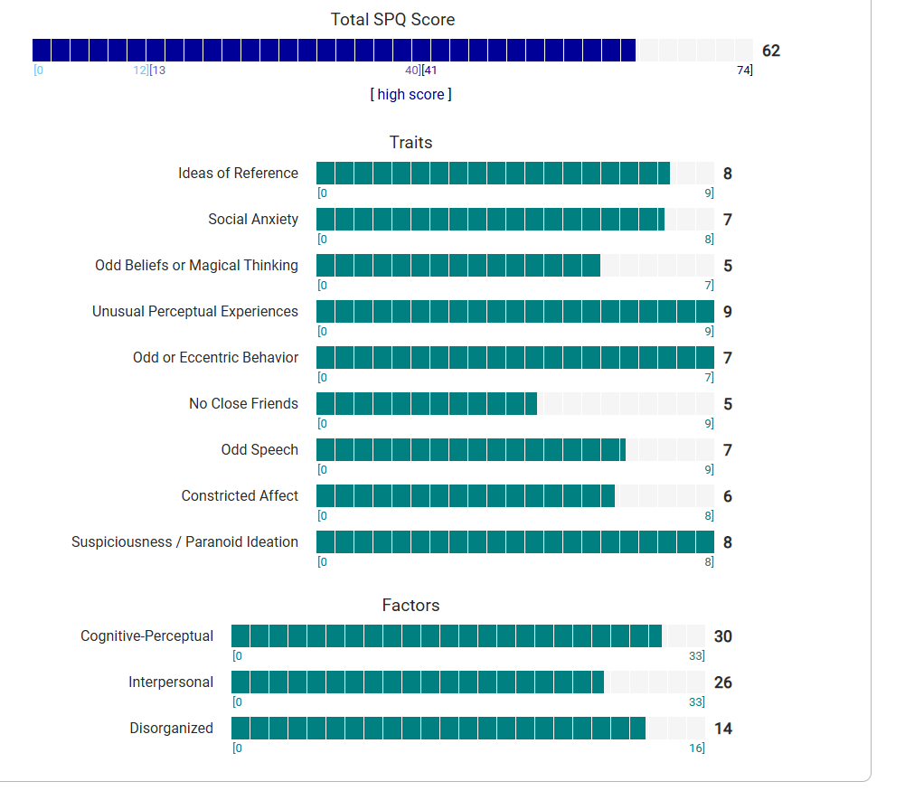 https://psytests.org/diag/spqen.htmlI have a theory that life as a transsexual, specifically a boardpassoid, causes the same type of anxiety that encourages schizotypy in the general population. To test this theory, I would really appreciate if you filled out this 74 question screening and responded to this thread with your results :)Thanks!
