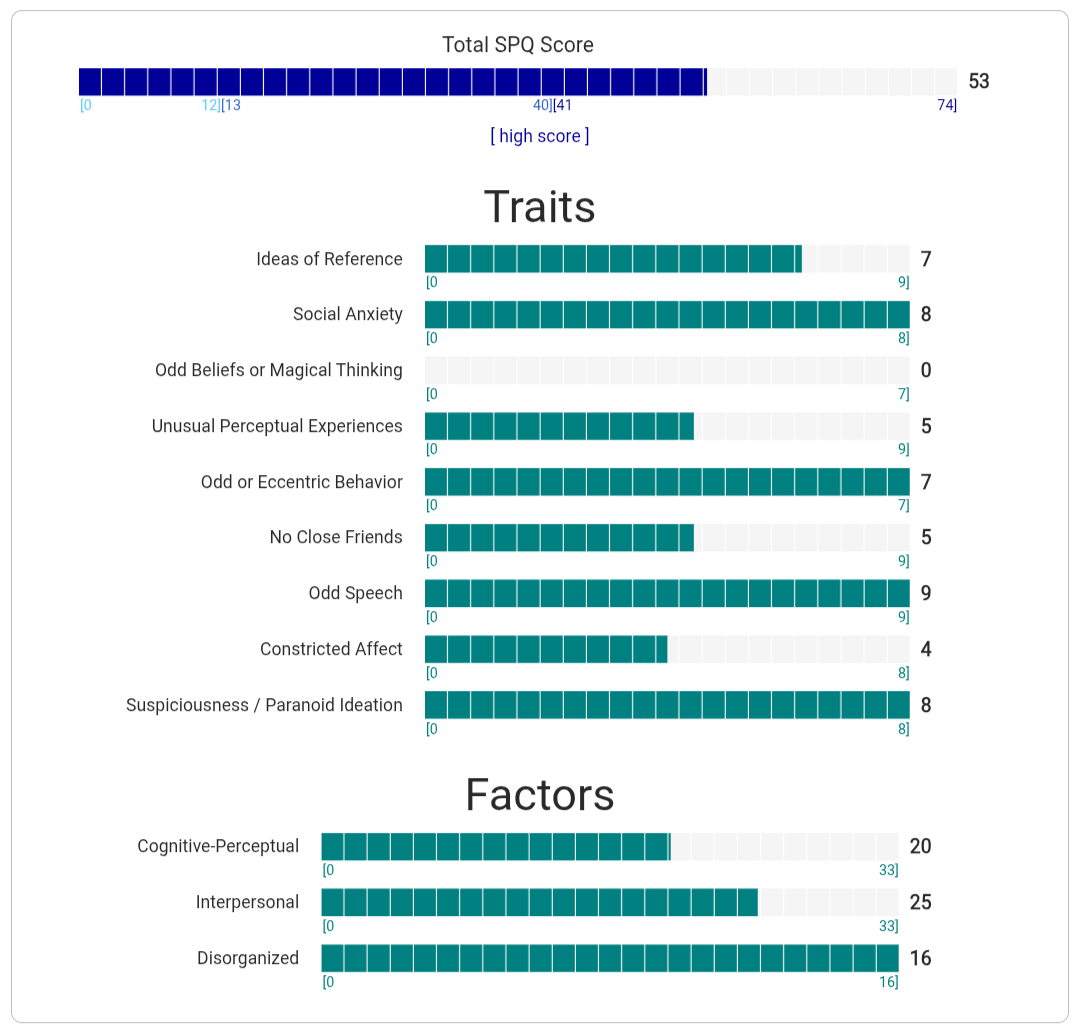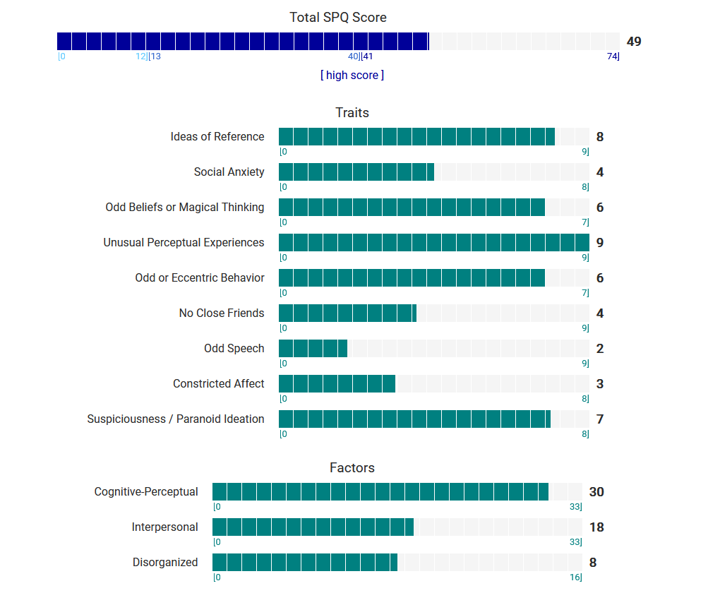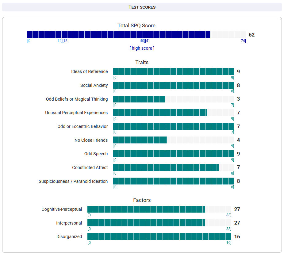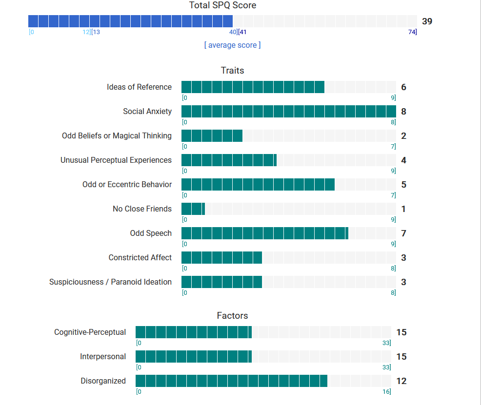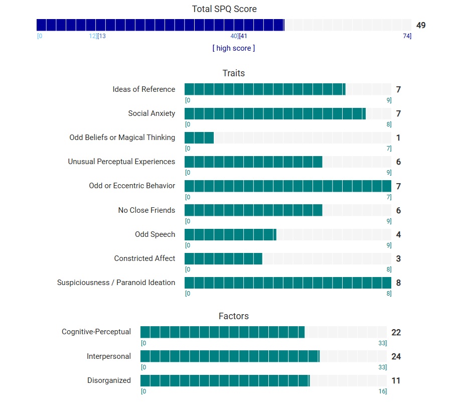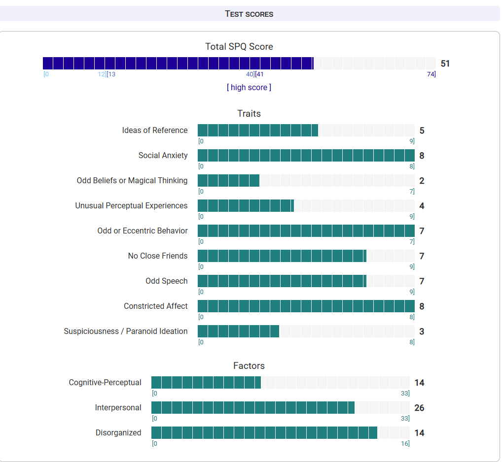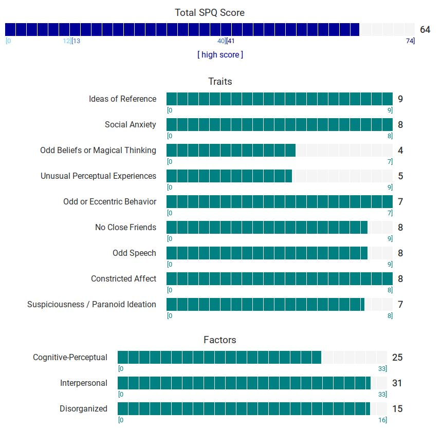 https://psytests.org/diag/spqen.htmlI have a theory that life as a transsexual, specifically a boardpassoid, causes the same type of anxiety that encourages schizotypy in the general population. To test this theory, I would really appreciate if you filled out this 74 question screening and responded to this thread with your results :)Thanks!