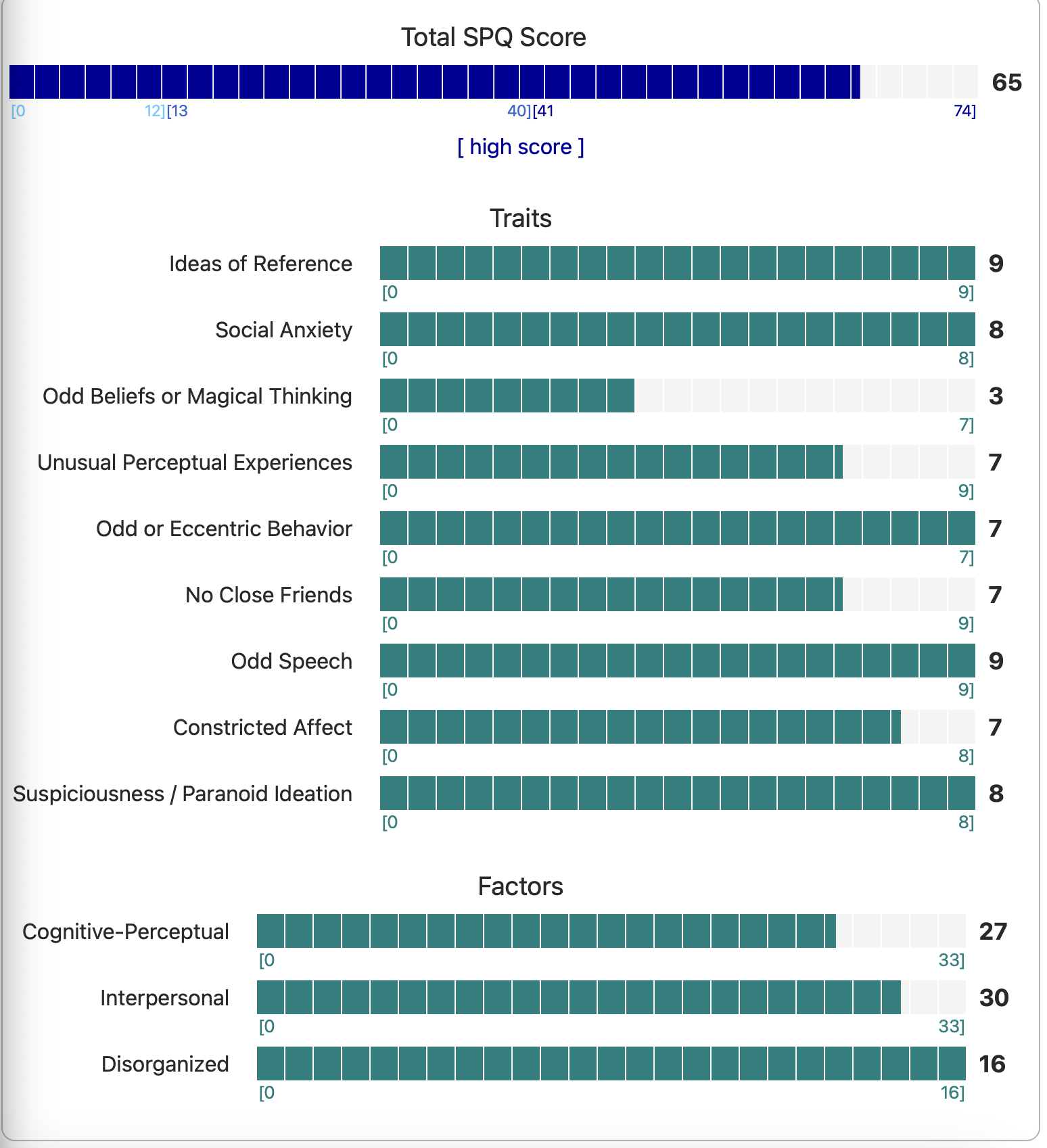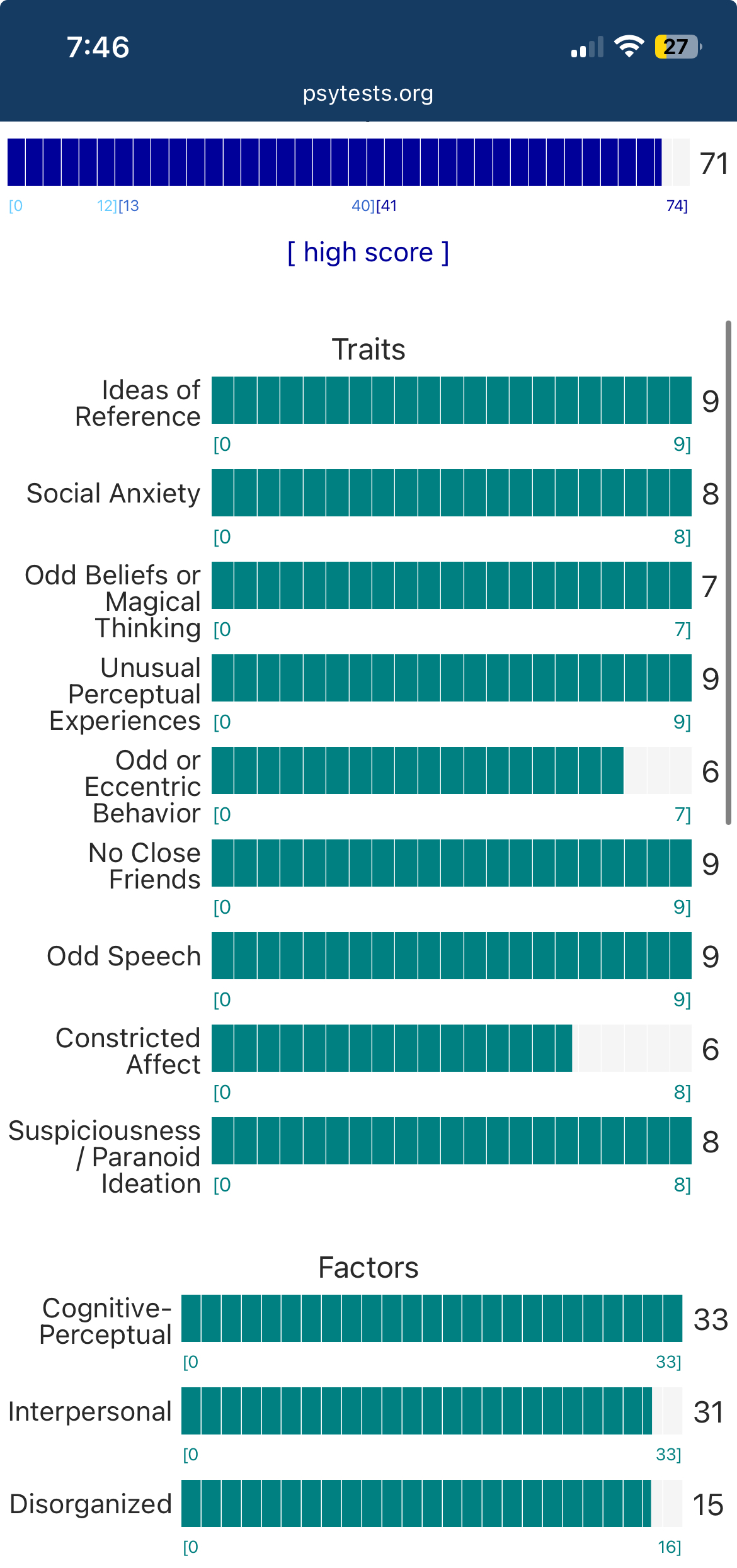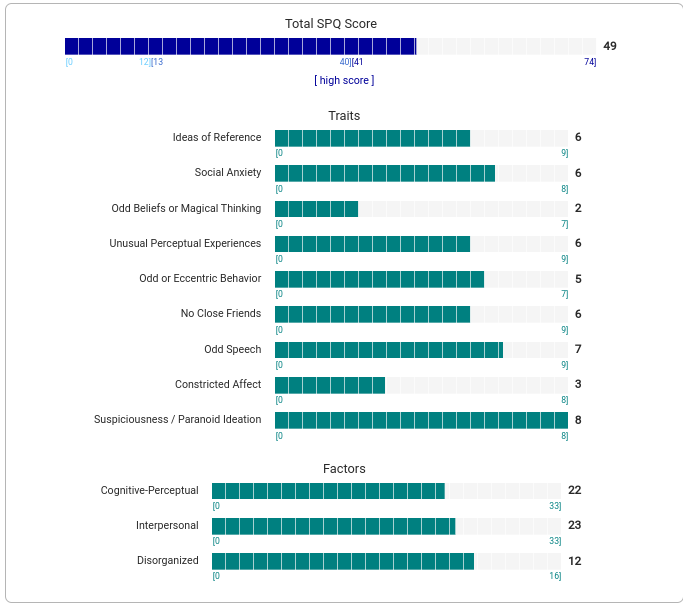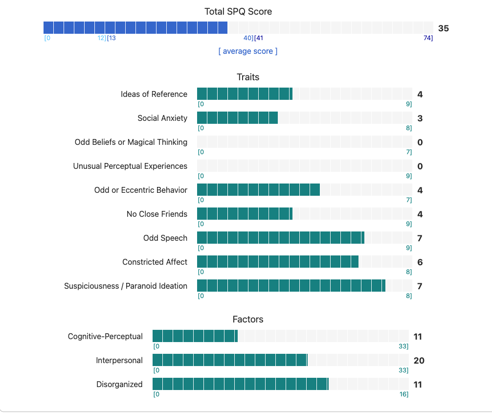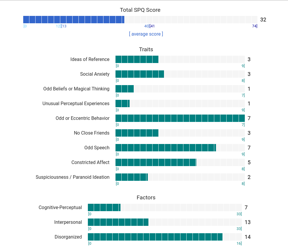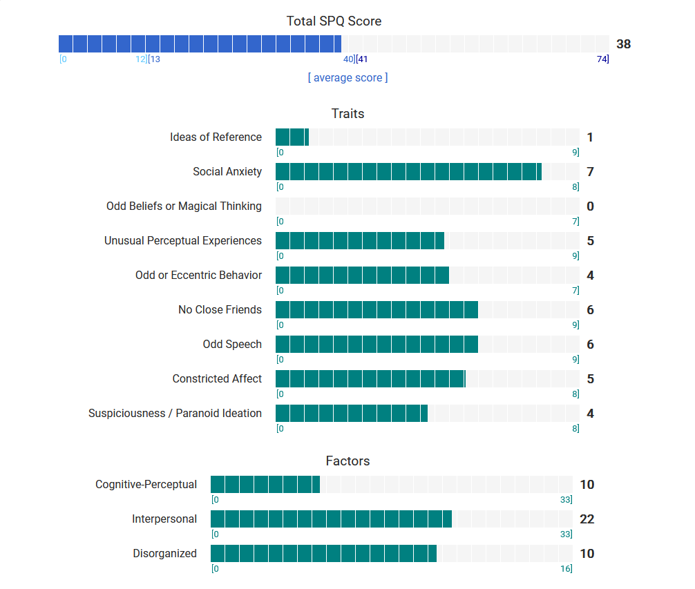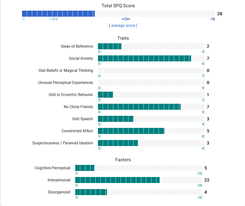 https://psytests.org/diag/spqen.htmlI have a theory that life as a transsexual, specifically a boardpassoid, causes the same type of anxiety that encourages schizotypy in the general population. To test this theory, I would really appreciate if you filled out this 74 question screening and responded to this thread with your results :)Thanks!