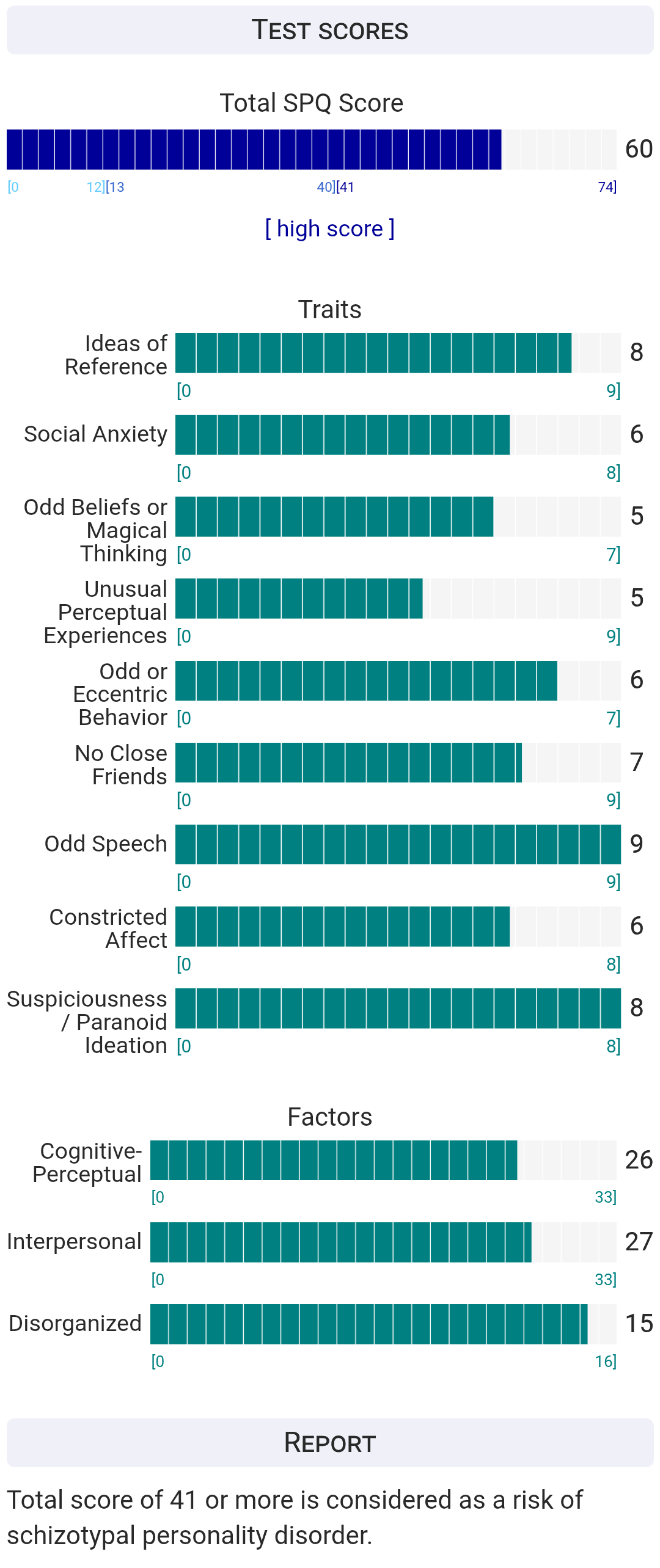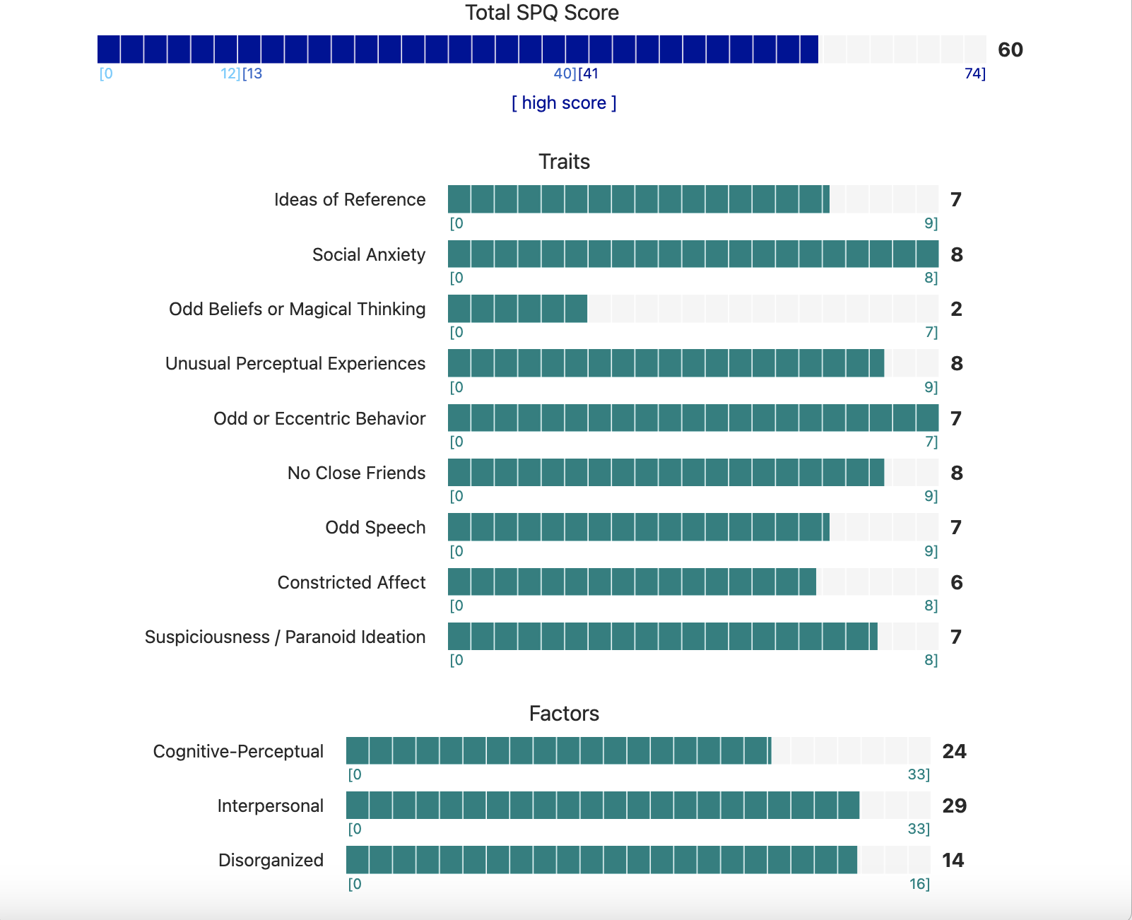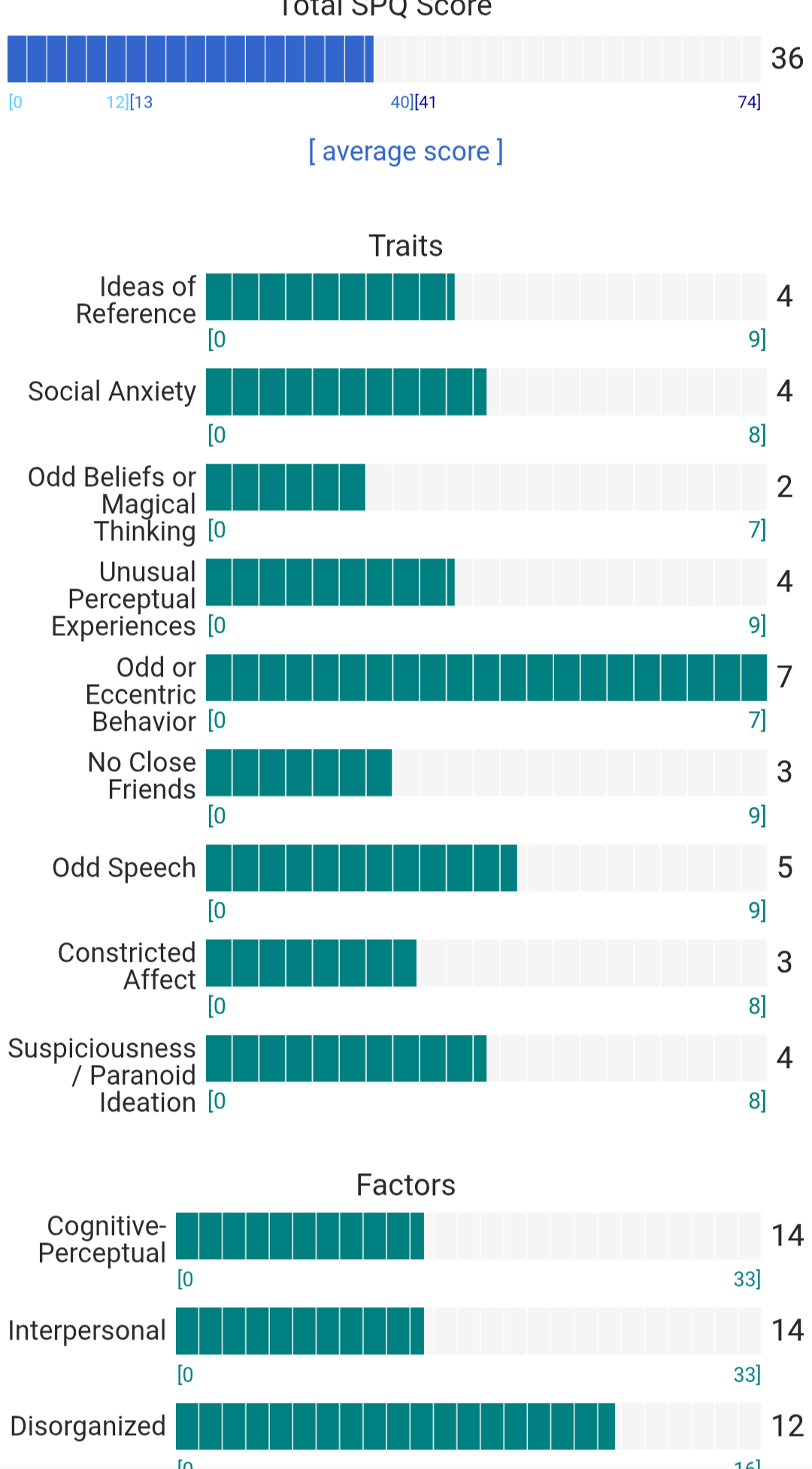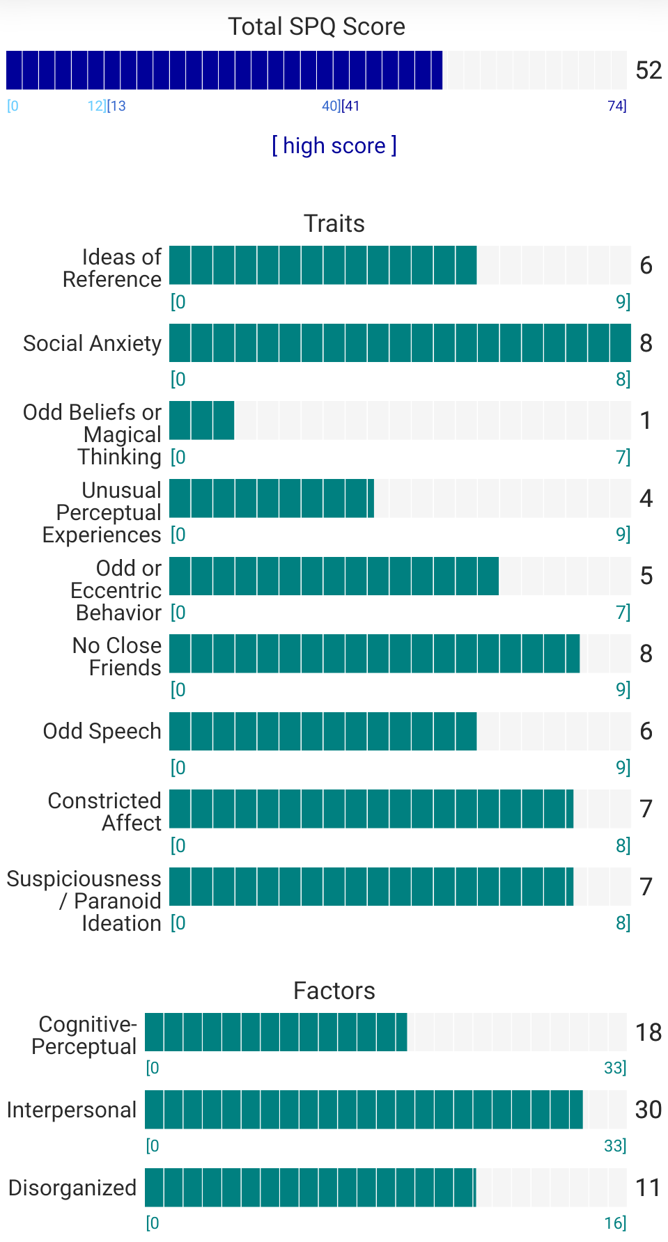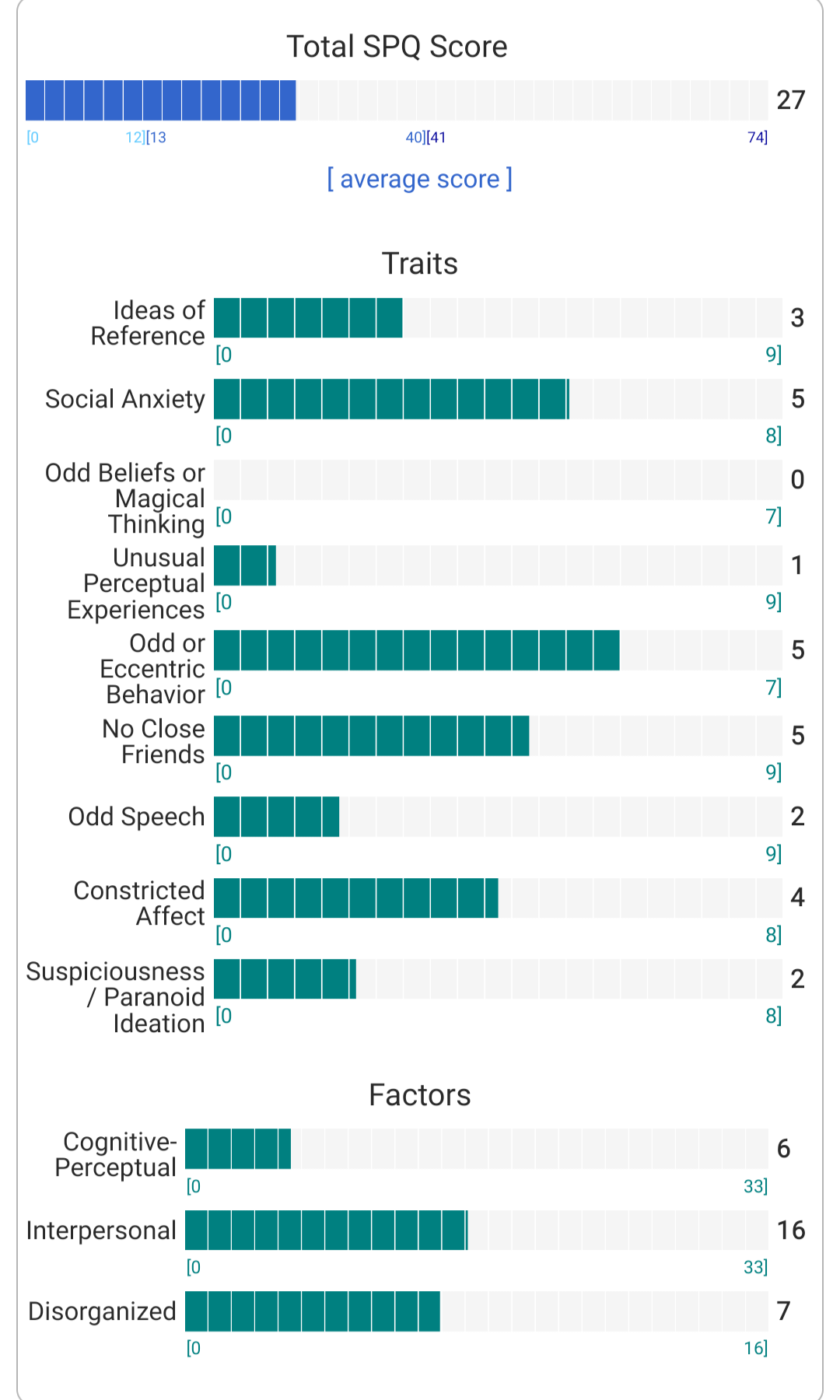 https://psytests.org/diag/spqen.htmlI have a theory that life as a transsexual, specifically a boardpassoid, causes the same type of anxiety that encourages schizotypy in the general population. To test this theory, I would really appreciate if you filled out this 74 question screening and responded to this thread with your results :)Thanks!