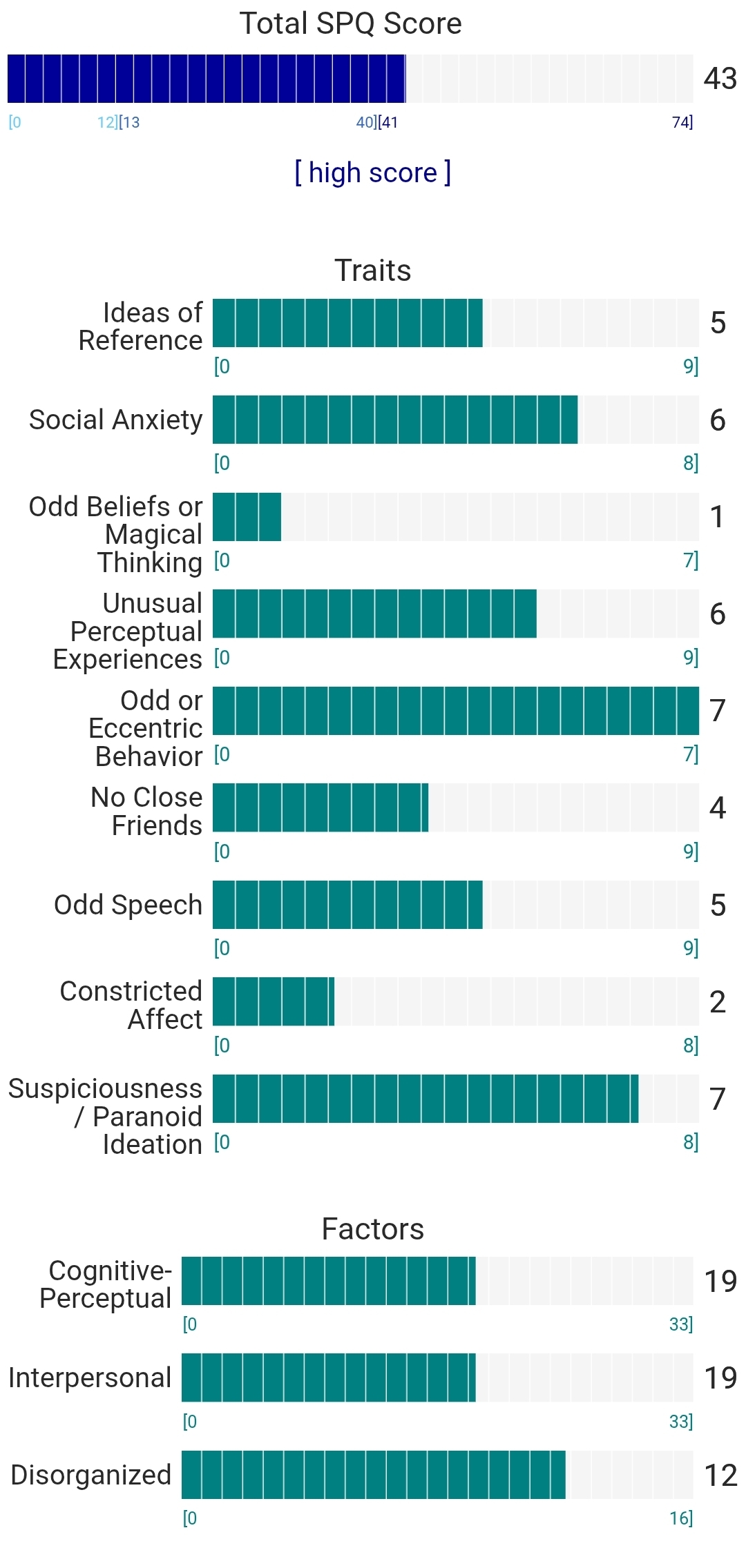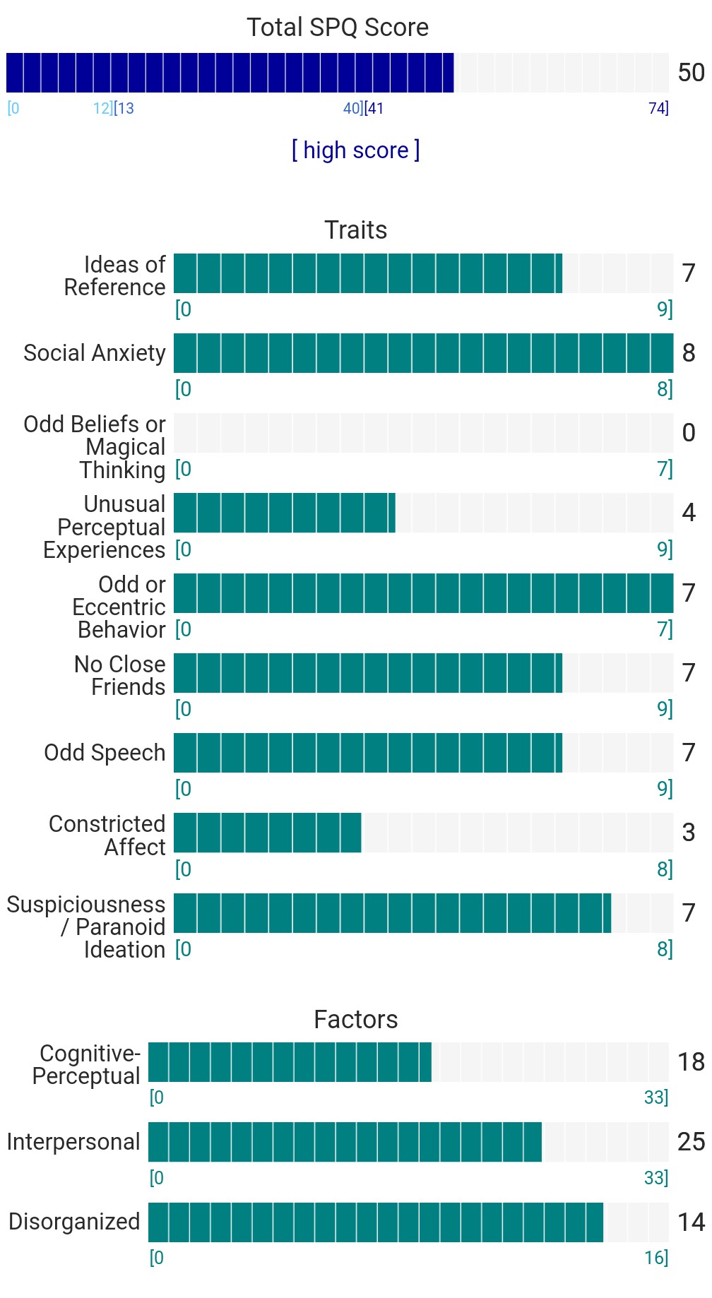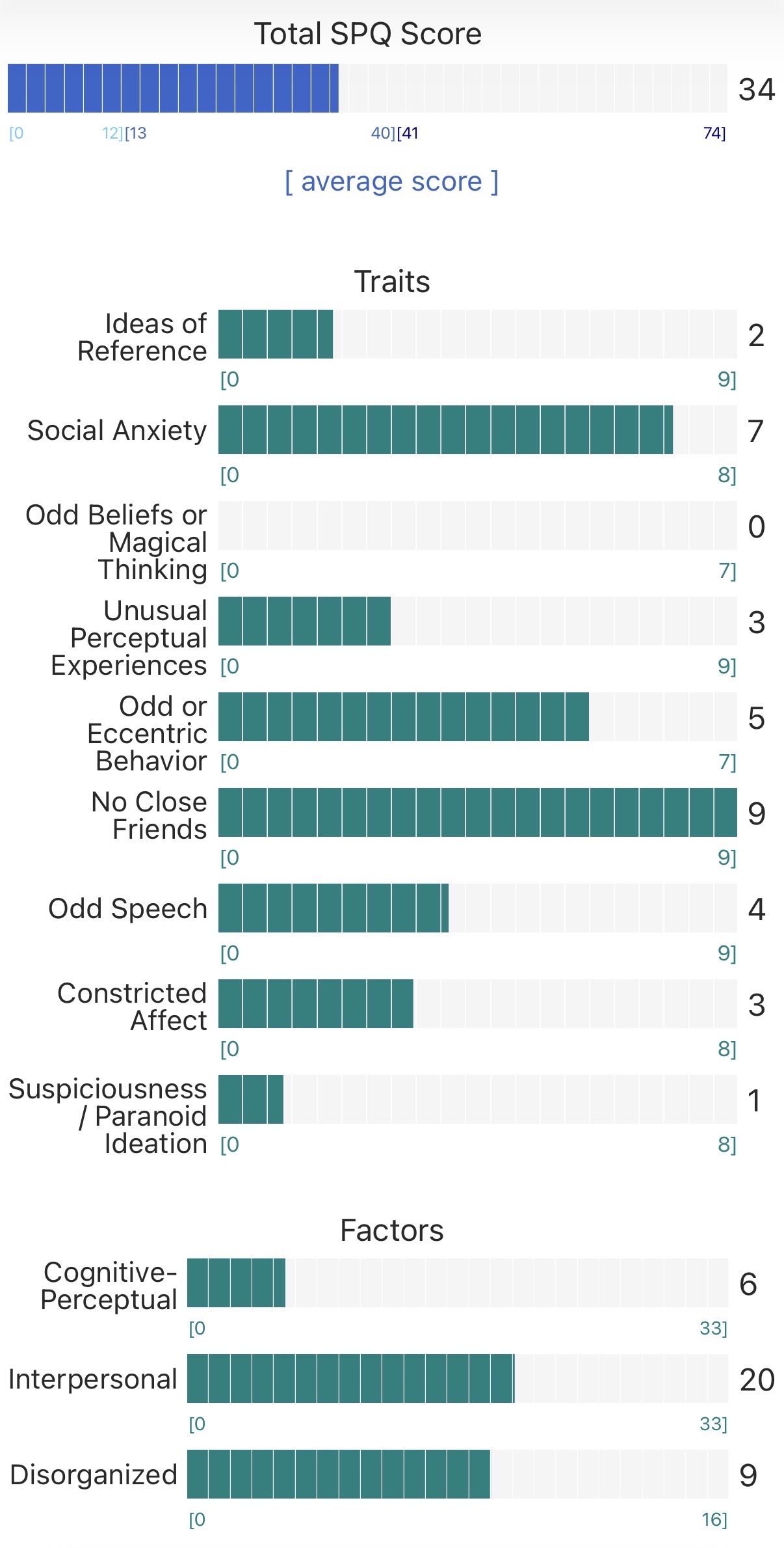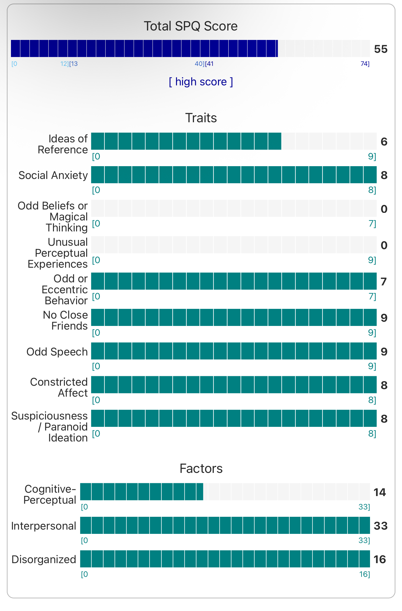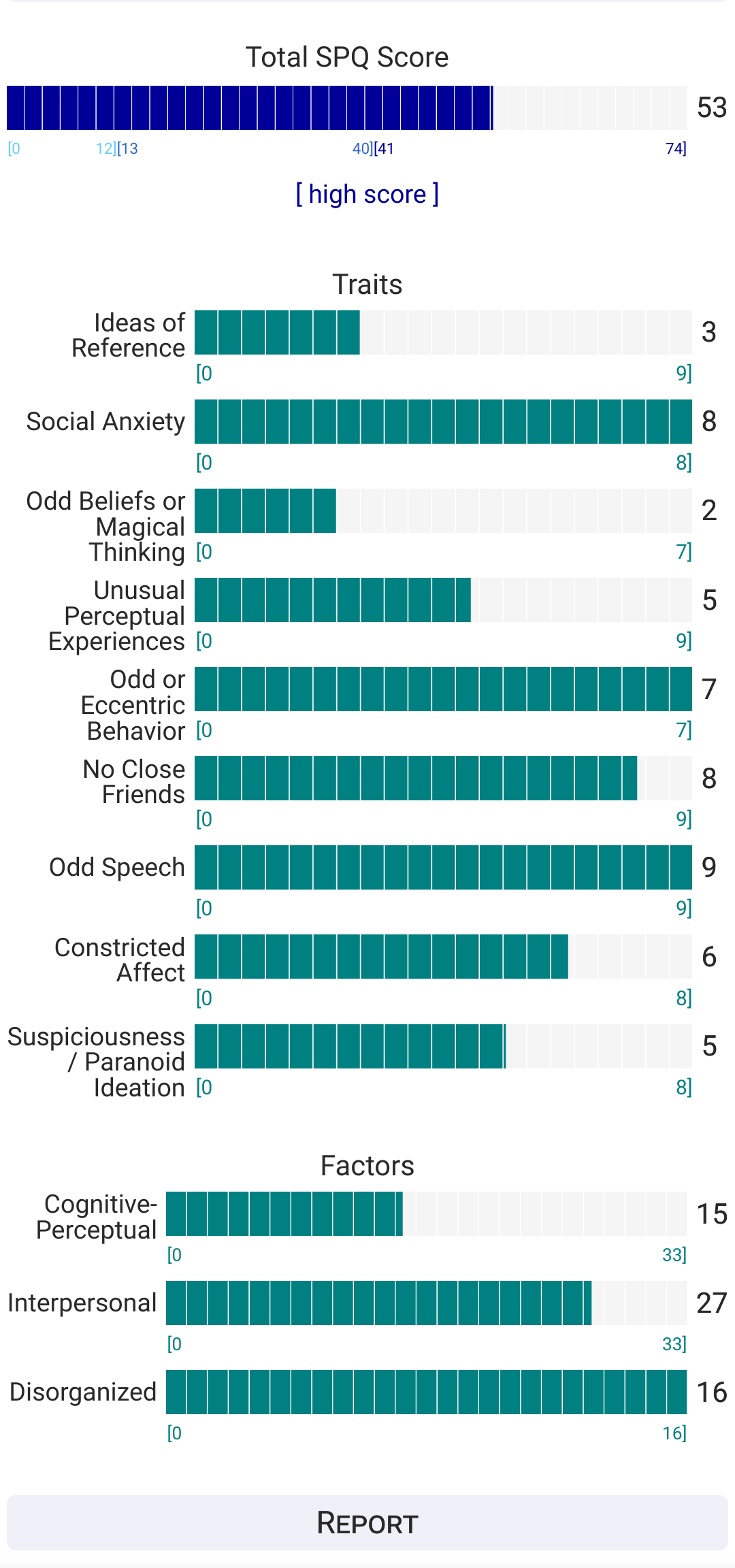 https://psytests.org/diag/spqen.htmlI have a theory that life as a transsexual, specifically a boardpassoid, causes the same type of anxiety that encourages schizotypy in the general population. To test this theory, I would really appreciate if you filled out this 74 question screening and responded to this thread with your results :)Thanks!
