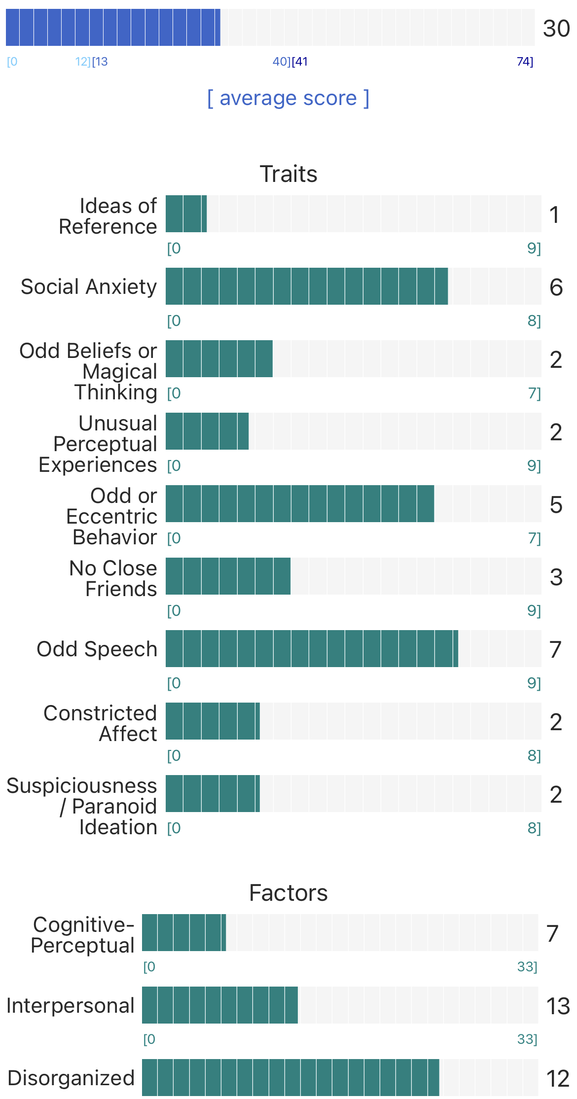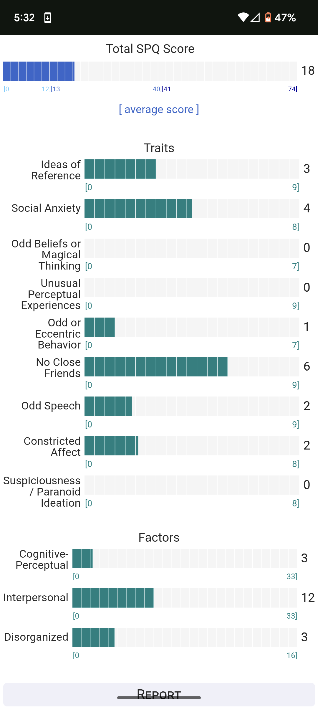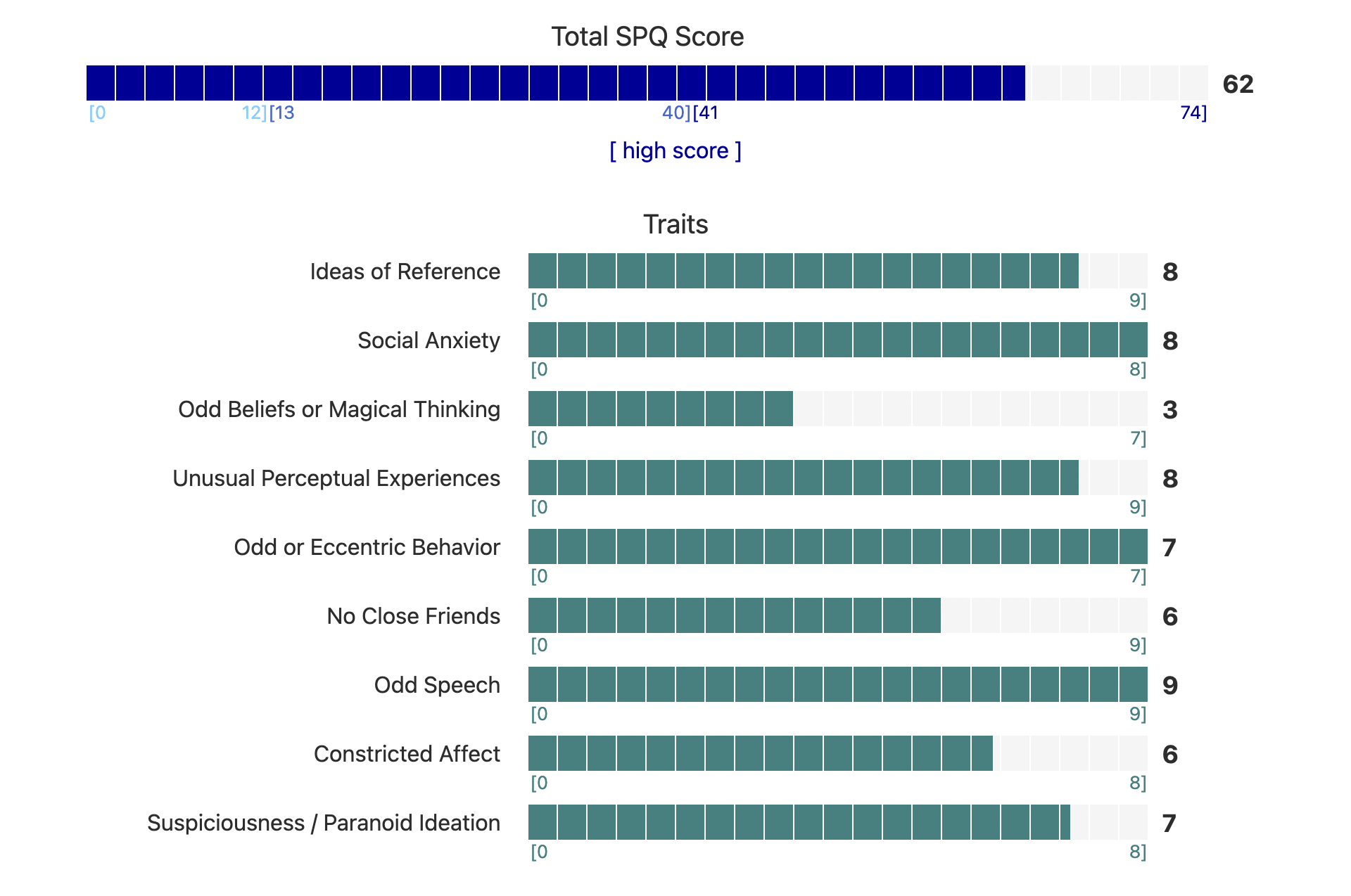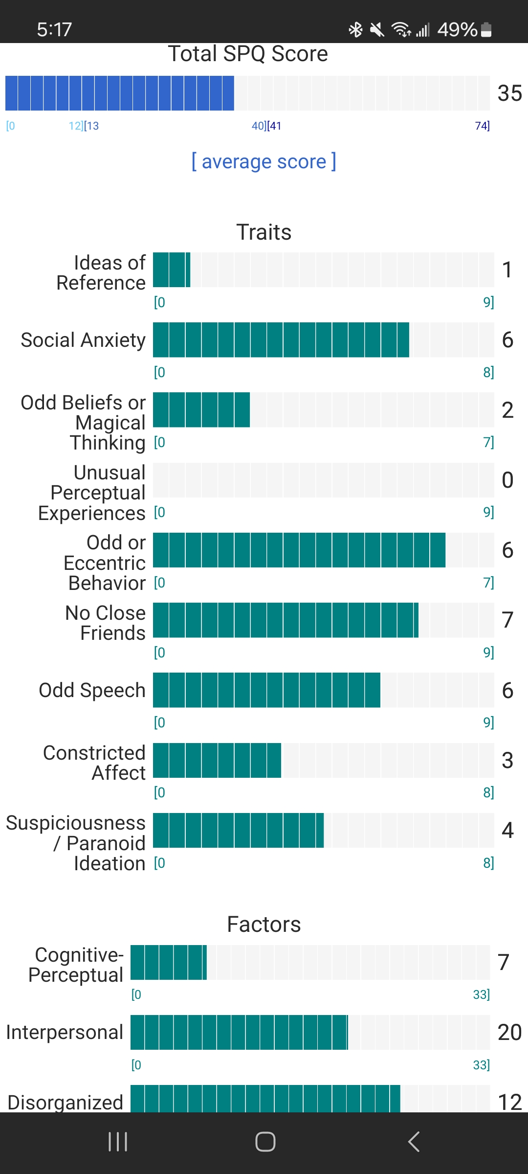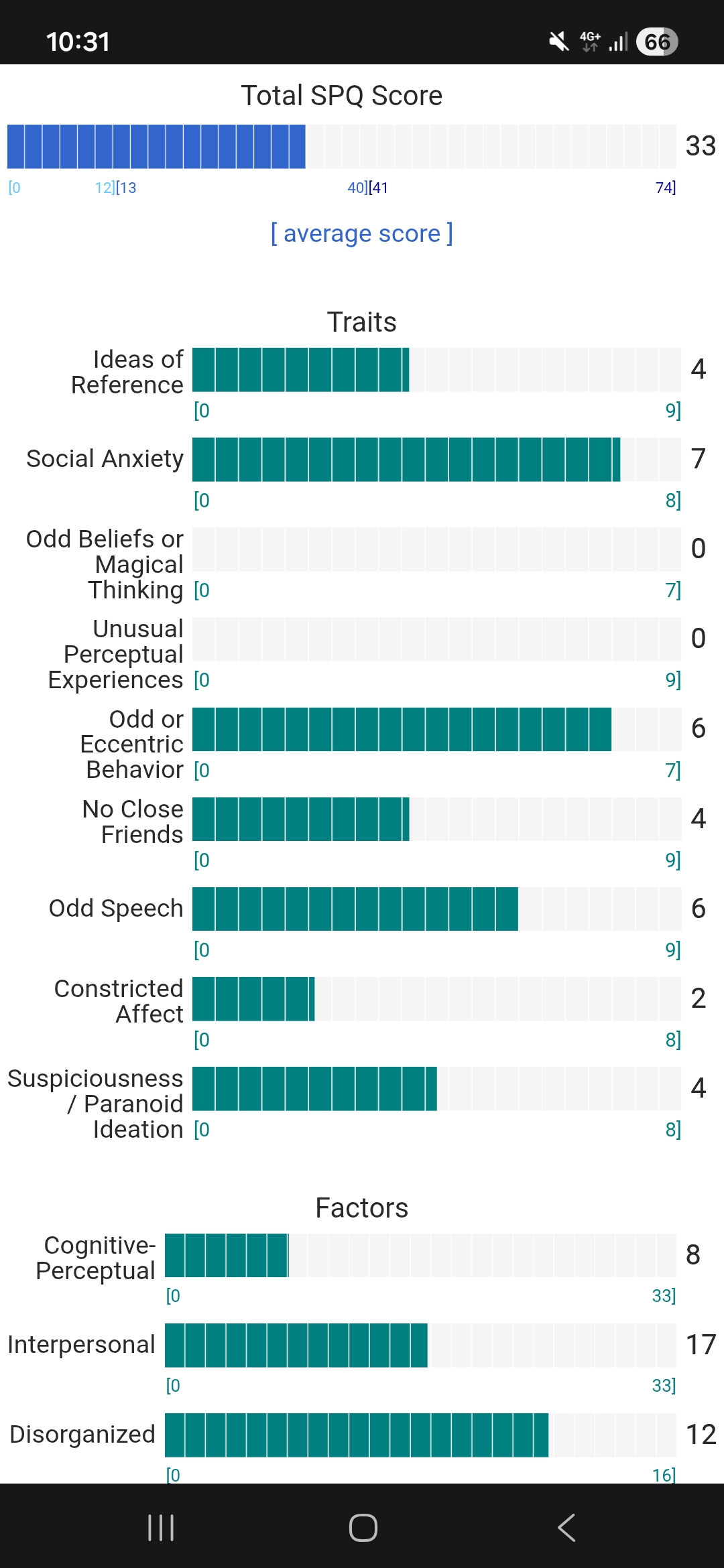 https://psytests.org/diag/spqen.htmlI have a theory that life as a transsexual, specifically a boardpassoid, causes the same type of anxiety that encourages schizotypy in the general population. To test this theory, I would really appreciate if you filled out this 74 question screening and responded to this thread with your results :)Thanks!