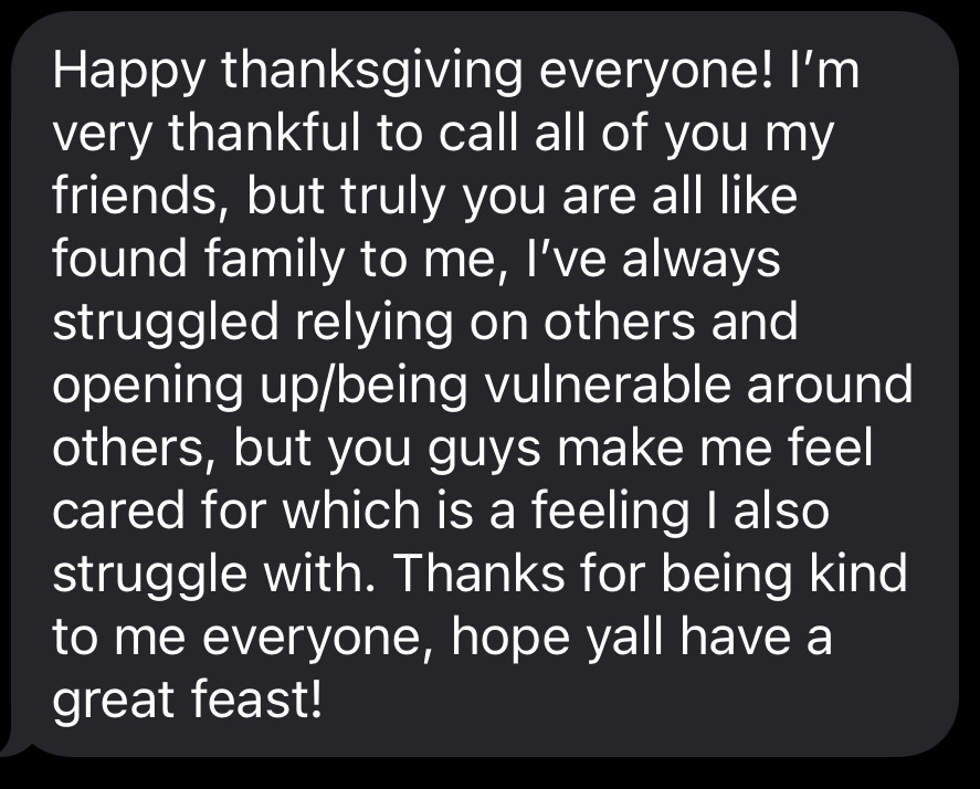 >>41809440>what are you thankful for?lovesuccessful transitionmy friendsfreedom and agencyfinally breaking the cycle