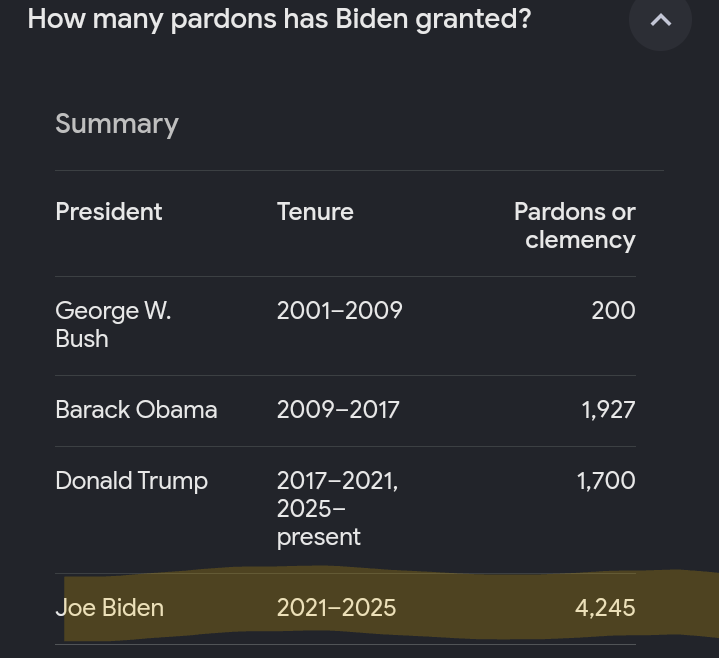 >>41978546Well there's a pending legal issue with prosecuting Biden era officials, considering Joe Biden gave them all criminal pardons prior to leaving office. You would have to know something about anything in order to know what I'm talking about. Biden issued a criminal pardon for the man that was the Secretary of the Department of Homeland defense, Alejandro Mayorkas.Do you see picrel ? Do you notice Biden pardoned more people than any other president in US history? That's because he issued pardons to all of the members of his administration that were breaking the law. So in order to prosecute, the Federal courts would first have to nullify these criminal pardons. Hhe issued criminal pardons to Anthony Fauci, Alejandro Mayorkas, and thousands of people who weren't facing criminal proceedings at that time, as a way to prevent them from being prosecuted.
