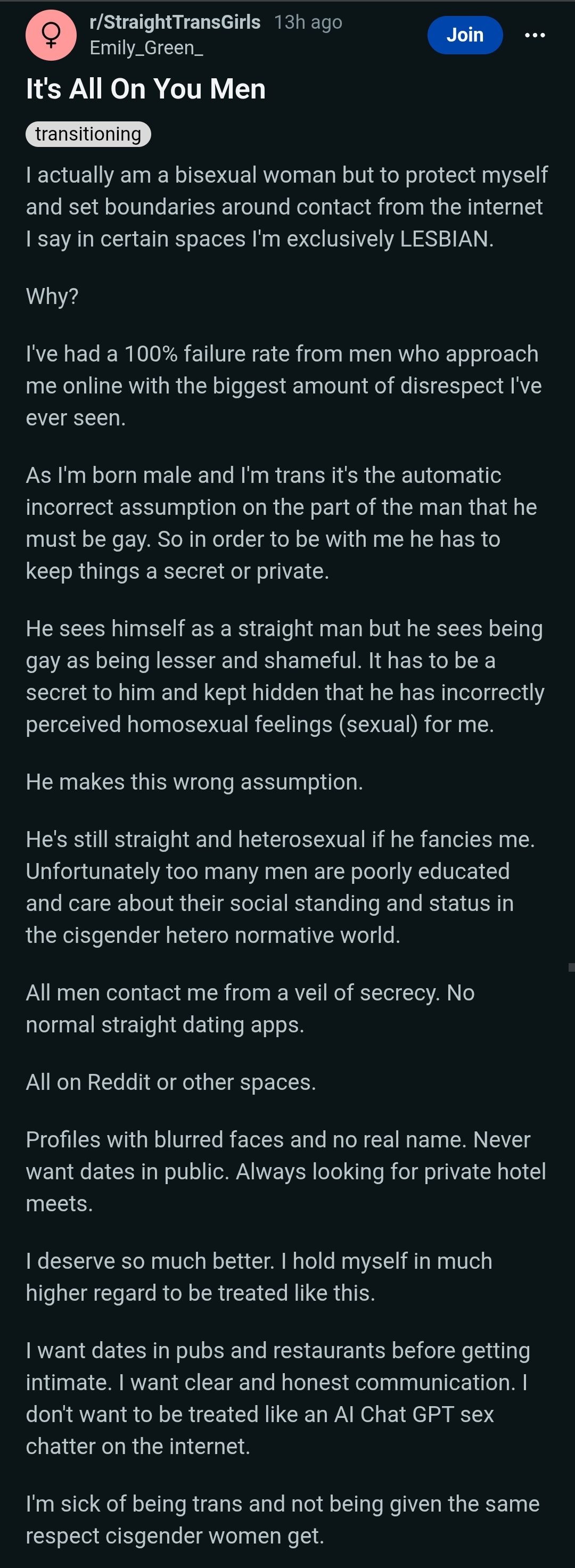 >>42039657Nah, most women are bisexual, including trans women. The only reason why there are so many bisexual trannies larping as lesbian compared to cis woman is that dating cis men tends to be more risky than dating other trans women, and trans women usually have misandrist brainrot
