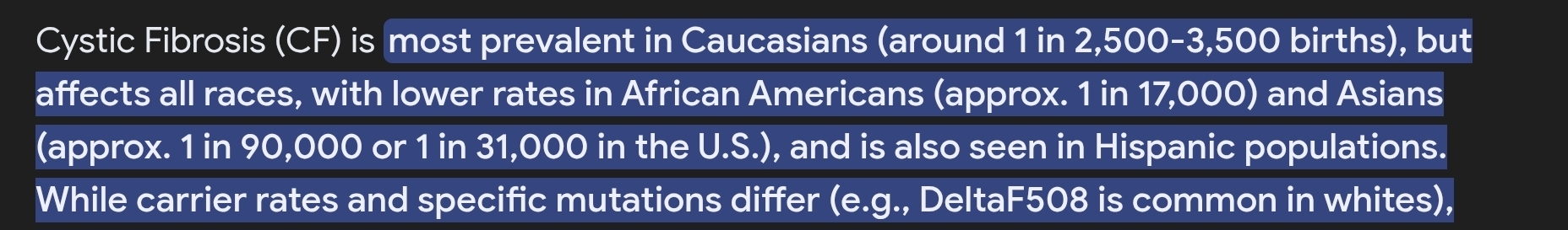 >>42062273There is a hypothesis that the cystic fibrosis gene persisted because people with cystic fibrosis are less likely to die of cholera and since people used to have children when they were like 15 back in the day the shorten life spawn wasent a problemThere is a medicine called trikafta that doctors say it will make people with cystic fibrosis live as long as people without it. And I'm gladly taking it so I don't think I'll die any soon so it isn't that tragic