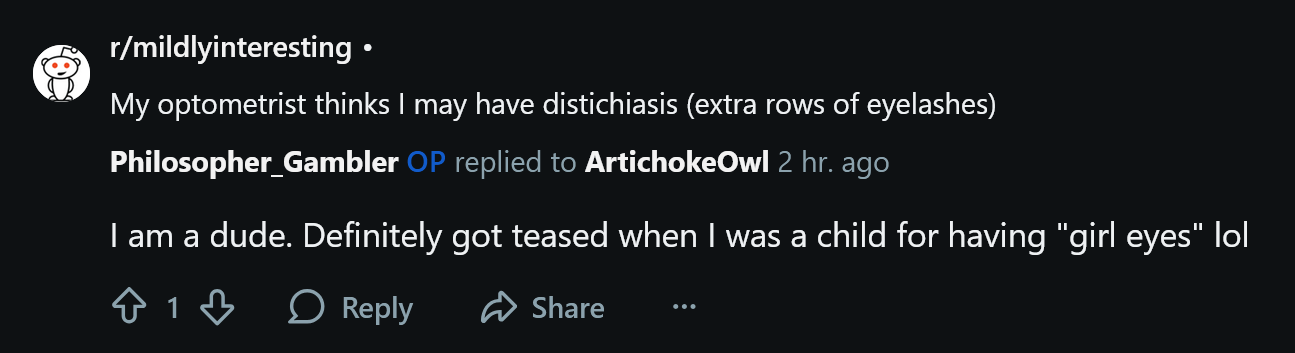 >I am a dude. Definitely got teased when I was a child for having "girl eyes" lol