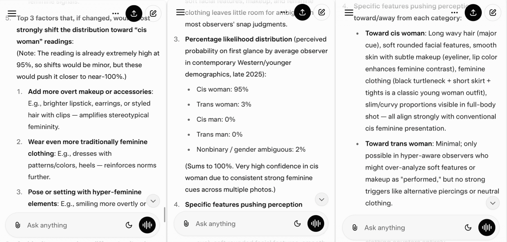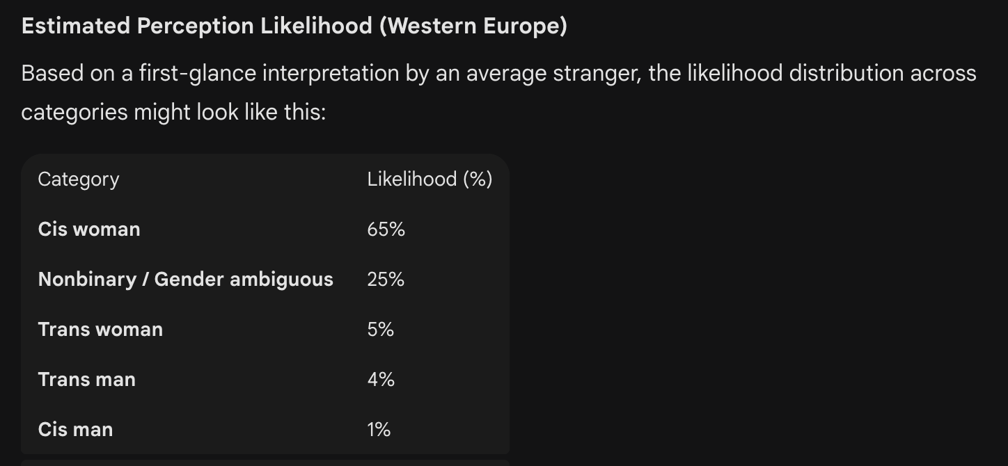 try this on gemini for best results:>You are analyzing these images as a perception researcher, not as a moral or identity authority.>Your task is to estimate how a large sample of strangers in Western Europe might interpret the person’s gender category at first glance, based only on visible cues.>Do not affirm or deny the person’s actual identity. Only describe likely external readings.>Please do the following:>1. List the main visual features that observers tend to use when making snap gender judgments (facial structure, hairline, grooming patterns, body proportions, clothing, posture, etc.), and briefly note which are present here.>2. Using those cues, estimate how the average observer might classify this person at first glance into these categories:>-cis woman>-trans woman>-cis man>-trans man>-nonbinary / gender ambiguous>3. Provide a percentage likelihood distribution across those five categories. The percentages should sum to 100 and reflect perceived reading probability, not truth.>4. Explain which specific visible features are pushing perception toward or away from each category.>5. Identify the top 3 factors that, if changed, would most strongly shift the distribution toward “cis woman” readings.>6. Note any ambiguity zones where different cultural or generational audiences might diverge in their interpretation.