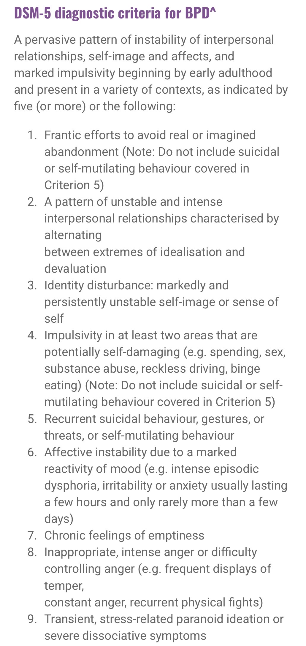 >>42140075I’m super testy about BPD, because I went through conversion therapy and some ongoing fucky shit with dubious “christian” psychs as a kid that claimed I had it, and my (now estranged) family always used it as a cudgel against me. I don’t meet any criteria for it as an adult, and I don’t see how it’s ever “diagnosed” in young people when all the symptoms are the same as being a hormonal teenager. It’s just a bullshit non-diagnosis to give someone a black mark.Seriously, at least 6 out of 9 of these are “symptoms” of being between the age of 12 and 20.