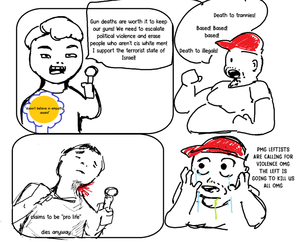 >>42140320Charlie Kirk believing that woman should have the right to defend themselves from rape using a gun is worth the possibility of a few people misusing guns does not make him “deserving of death”. If you believe this, then that means you also believe you should be run over and killed with a car because you don’t think the small number of car deaths should be reason to ban all cars. This is literally your position. You can’t have one without the other. Charlie Kirk did not say that we shouldn’t care about people, he said the concept of empathy is flawed because it implies that we can know another person’s mind and feel what they are feeling, which is presumptuous and untrue. He said that we should use the term “sympathy” instead”.Charlie Kirk never said to “kill all trannies” or supported anyone else saying this. The fact that you feel entitled to lie about him saying this to “justify” his murder is an example of textbook cluster B thinking.