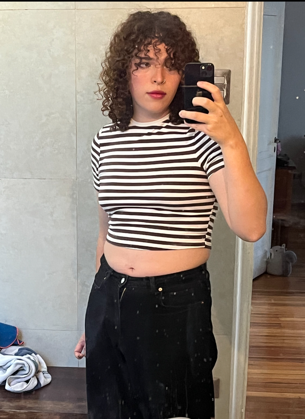 cute but wear your pants higher, they should sit at your waist, not hip, probably above your belly button. showing belly is a privilege that requires hips or a female rib cage unf