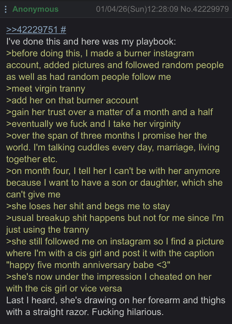 >>42230241as if any chaser here has had sex with a tranny, let alone sex