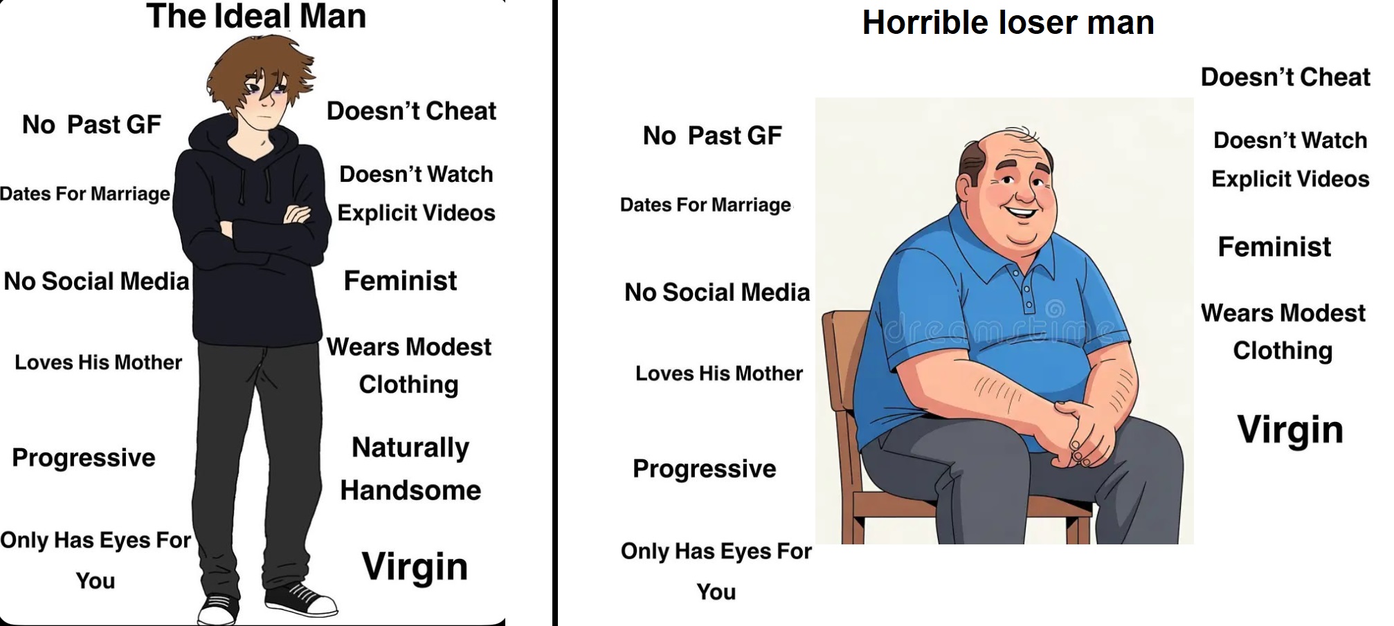 >>42233213You're already intentionally talking past me. Some people don't get love for reasons outside of their control. For these people, love is not necessarily impossible but it is so unlikely as to be effectively impossible. So long as these people are men, feminists do not have a problem with it. You unintentionally give up the game with what you focus on. Women fail romantically because they're subject to forces beyond their control. Men fail romantically because they make the wrong choices and need to pull themselves up by their bootstraps.