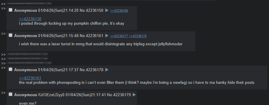 >>42234413People here hate me and i should never ever post again.Basically just the usual standard you'd see on the board. Loser. Generally depressed. Troon thoughts. Ive made a couple of posts last tred not gonna repeat my talking points.