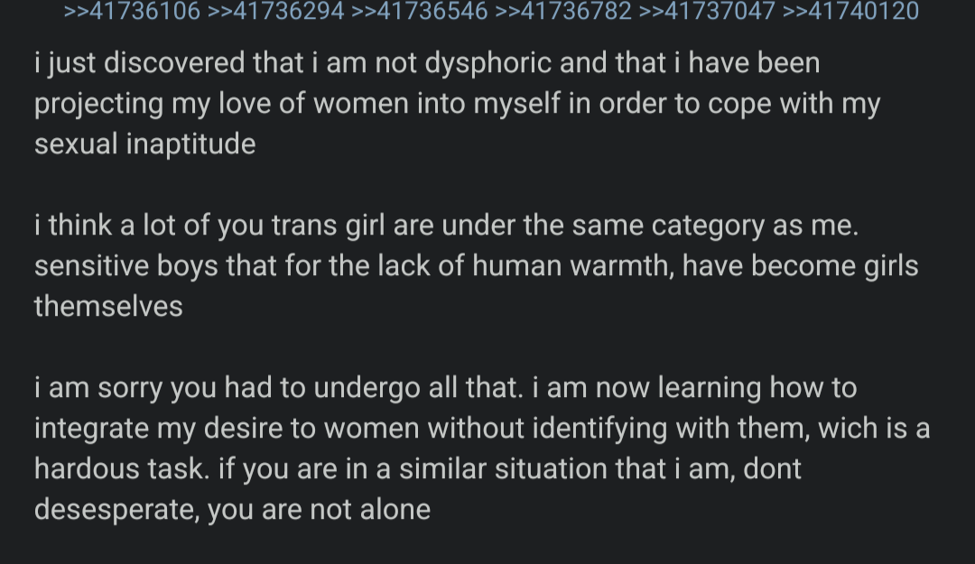 >>42251187is it? i feel like it’s hugboxxy mostly in the ways that serves people’s own self hatred. less “omg you pass”, and more “fuck you, you mog me. i’m irredeemably male and you look better than me, dipshit passoid fakemoder”