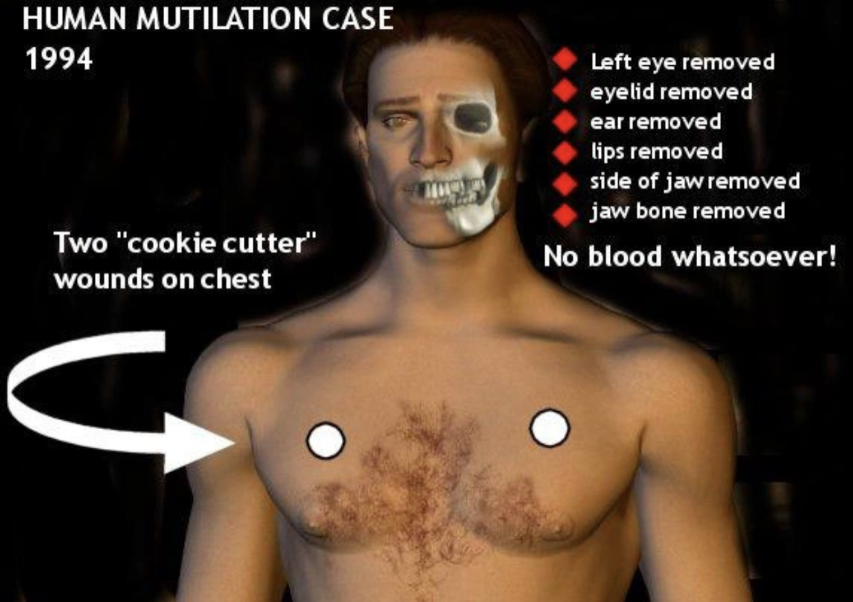 >>42267570Cattle and human mutilation that are suspicious and strange (ones considered to be made by ETs) have nothing common with what cartels are doing. Unless cartel know how to drain whole blood of cattle in less than few hours in the middle of nowhere US ranch without leaving any trace on the ground or on the subject. Add to that removal of eyes, tongue and jaw with surgeon's precision which is super common in these case. Plus removal of all organs and through small round holes without cutting of the body on random field.These cases are similar and observed worldwide so unless there is some worldwide cartel mafia made of top surgeons that are doing this shit for decades without any fucking trace I'm not buying any of gay normie explanation. Better do some research on this topic.any birdfags above can fuck off