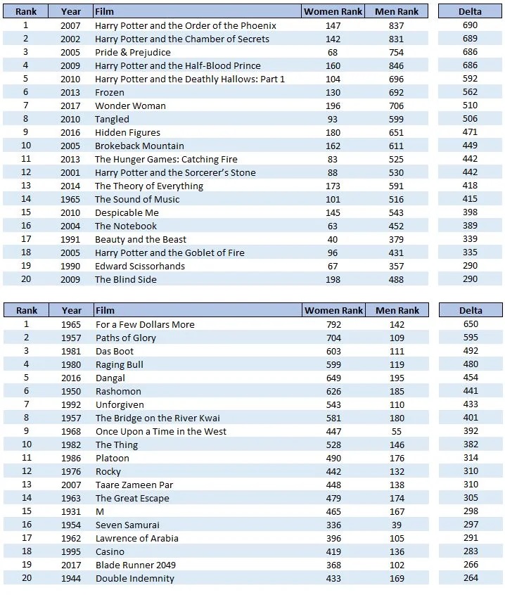>>42275394Its sorted by the average difference between genders on the right (delta)Top chart is the movies women liked disproportionately more than men, and the bottom chart is the movies men liked disproportionately more than women