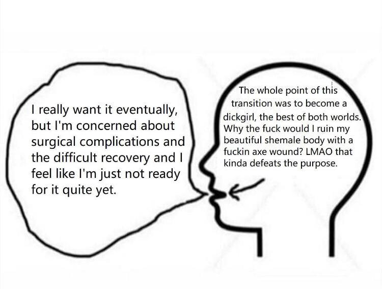 >>42282975OP maybe this is a blessing in disguise because now you can, you know be a woman and not some kind of weird tranny monster. Maybe get SRS? I did it and it's fun.