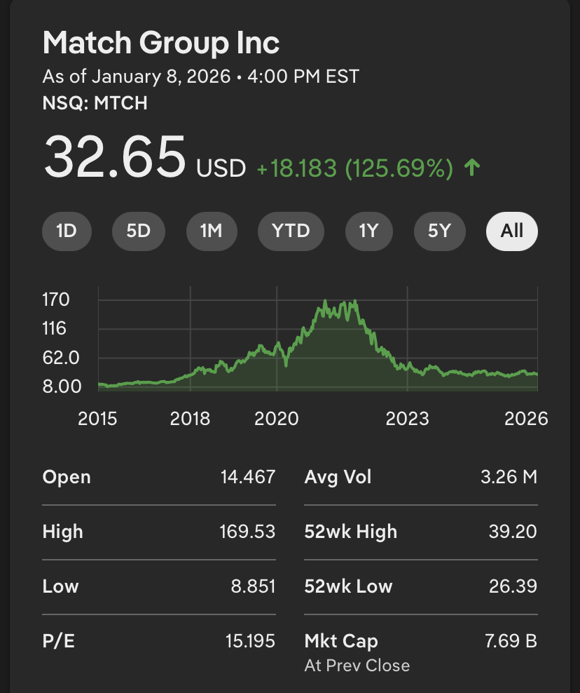 >>42283431I think most dating app companies have basically crashing or failed at this point. Pretty much all of them are owned by match (tinder, pof, hinge, etc) with bumble as the exception, and if you look at the companies stocks, theyve all nearly flatlined. Tinder is a literal ghost app of bots. Reminds me of myspace. Im not really sure if online dating in the dating app sense will come back. I think everyone has moved on and dont care.