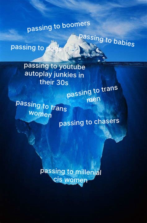 reminder that trans women passing to trans women is only halfway down the glacierchasers are not on the iceberg cuz they dont know what a woman looks like