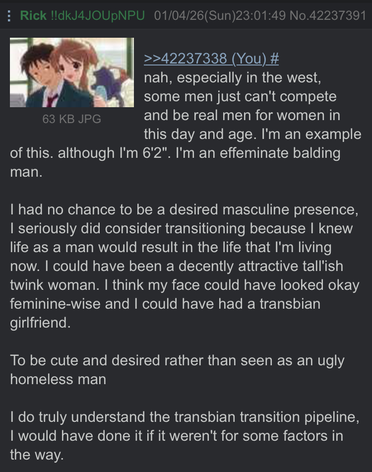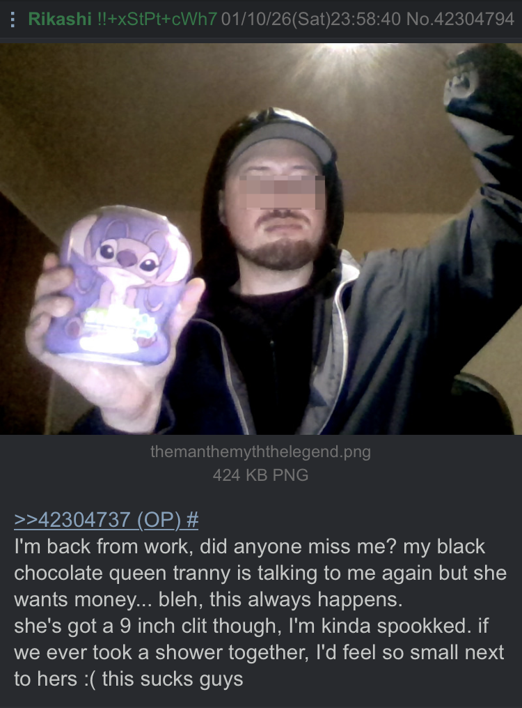 I love how he comes back every couple of days thinking we'd forgotten his antics, lies and crashing out or hopes a new tranny starts posting and falls for his fake persona. My favorite lie of his is "my trip got cracked" lmao.