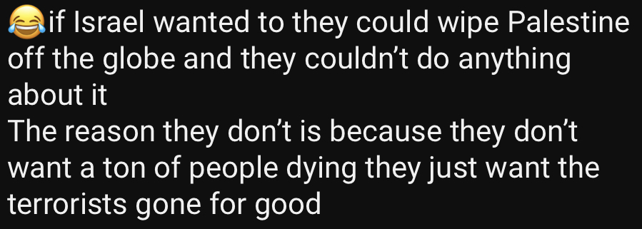 >>42339772WHAT fucking genocide, lol? Do you not understand how war works? Palestinians aren’t even the truly suffering right now. Look at fucking Sudan. Look at what the Chinese are doing to the Uyghurs Anyone who focuses on Palestine doesn’t actually care about humanity. They are complicit, useful idiots, used to deflect actual horrors.