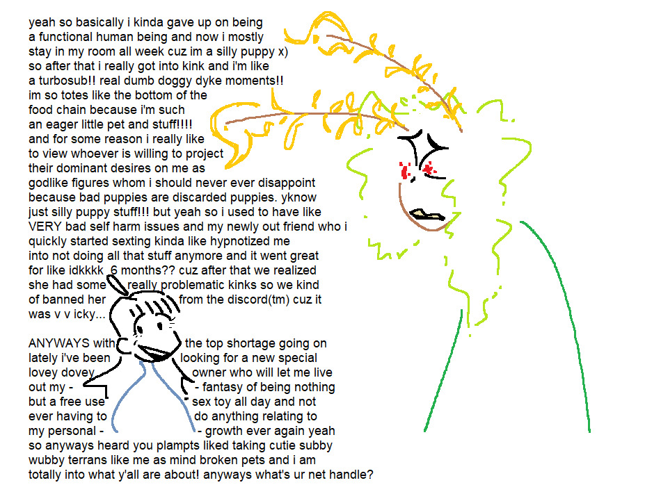 >>42359852the human domestication guide is an open text world where a race of plant aliens called the affini whom live in a communist utopia conquer the human race (and other races) and take human beings as pets. inside this concept, there is a lot in-universe lore, like those who are wild and more difficult to domesticate or how mtf feminization is included inside the domestication. the affini are knew for their hypnotic nature and how in this domestication they brainwash their human pet. this is a kink-based creation by a stone cold lesbian. they have a official wiki and server, though they are insufferable, the wiki is a great source of information, ill link it here so you can give a readhttps://hdg.wiki/