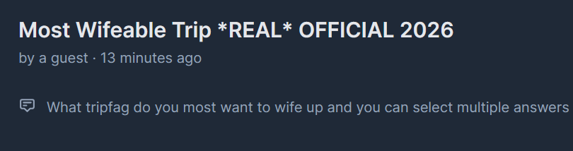 Stop! Before you bust! Chaser to chaser, bro to bro, we need to have a talk. These last few weeks I’ve noticed you simping and developing parasocial feelings for a trip t word in that gay discord server you love. We both know that it’s time to stop. It’s time you grow up and become a man buddy. Vote anon :) and leave those attentionwhoring trips in the dust.