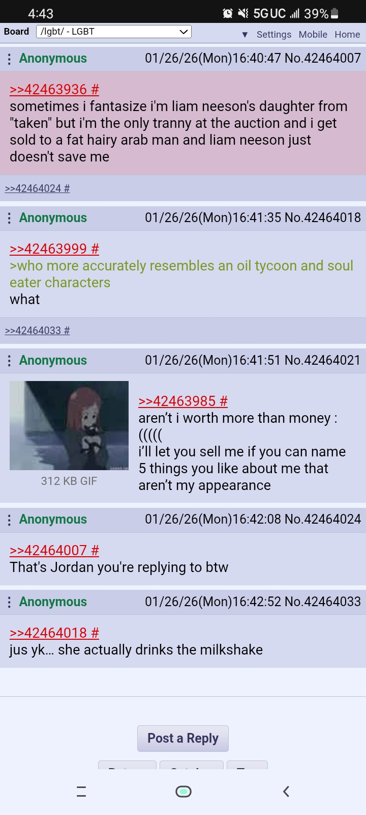>>42462046I hope this 4chan drama really isnt real, cuz you shouldnt have a sex slave, that is not good