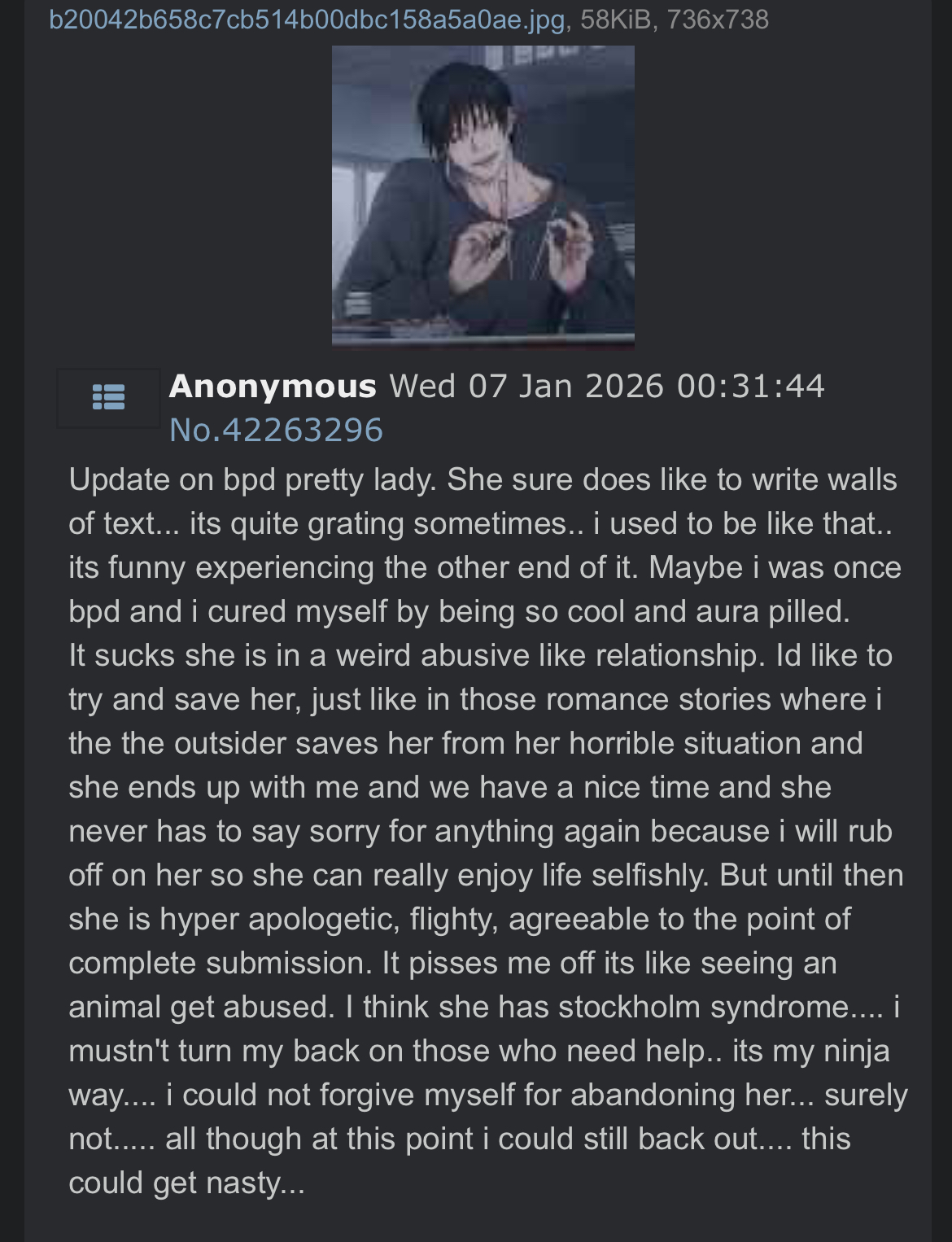 >>42497402Traumatized woman wanting closure is more creepy than an incel jerking off to her and posting about it, got it.