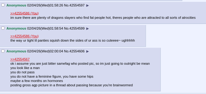 >>42554567ok i assume you are just bitter samefag who posted pic, so im just going to outright be meanyou look like a manyou do not pass you do not have a feminine figure, you have some hipsmaybe a few months on hormonesposting gross agp picture in a thread about passing because you're brainwormed
