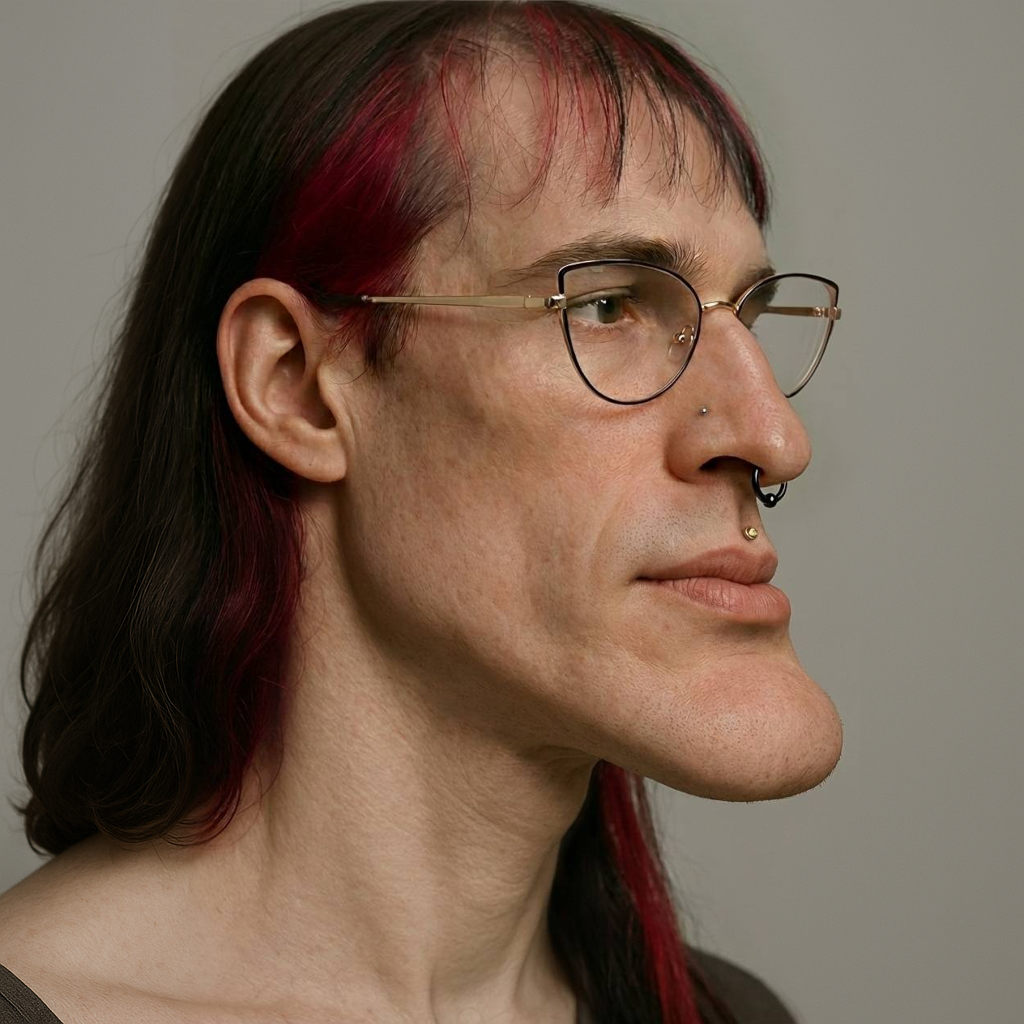 >>42560741Why did you pick the widest and largest model of men’s eye glass frames to look feminine? Seriously, post a single example of a cis woman wearing anything remotely like that.