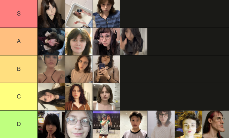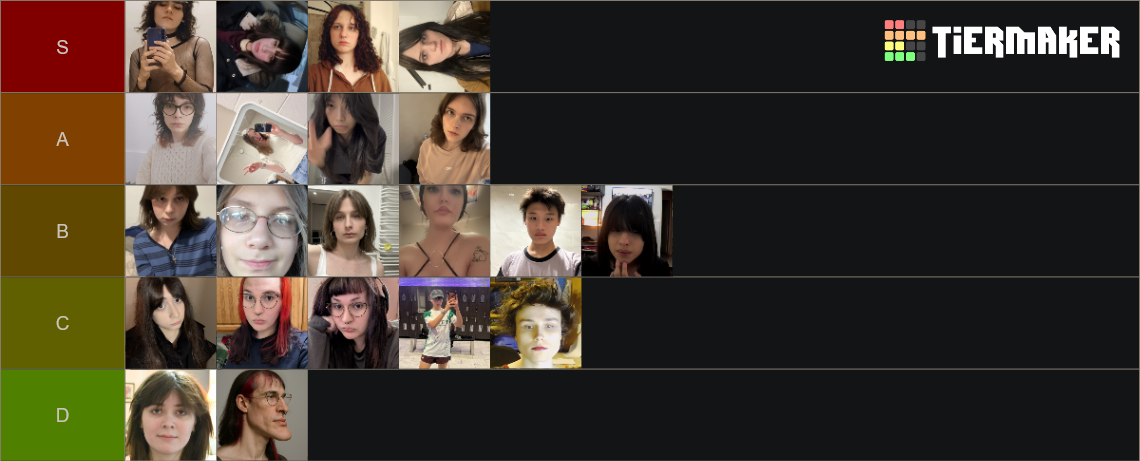 >>42564824I agree with this almost completely but the girl with round glasses in B needs to be bumped down a tier. I think she's gmi though if she gives hrt time so maybe that's worth something. the agp slut with the ears should be top of S tier though she is literally perfect and I wanna make out with her. The others are in the right tier enough that I agree
