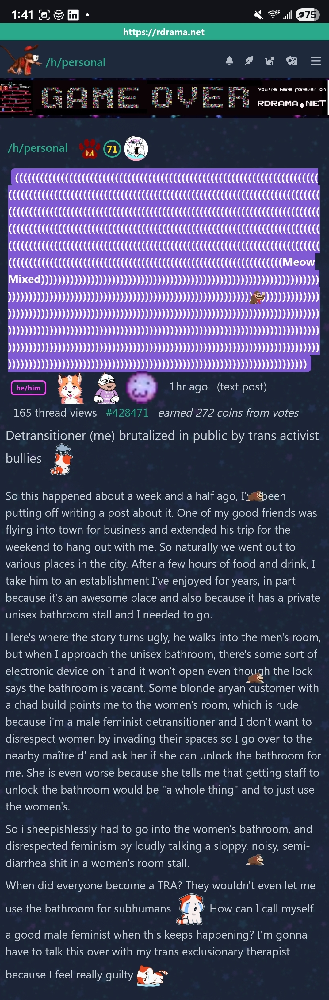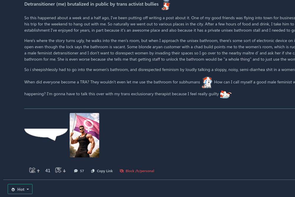 Do trannies and detransitioned trannies really get forced into the women's bathroom?https://rdrama.net/h/personal/post/428471/detransitioner-me-brutalized-in-public-by