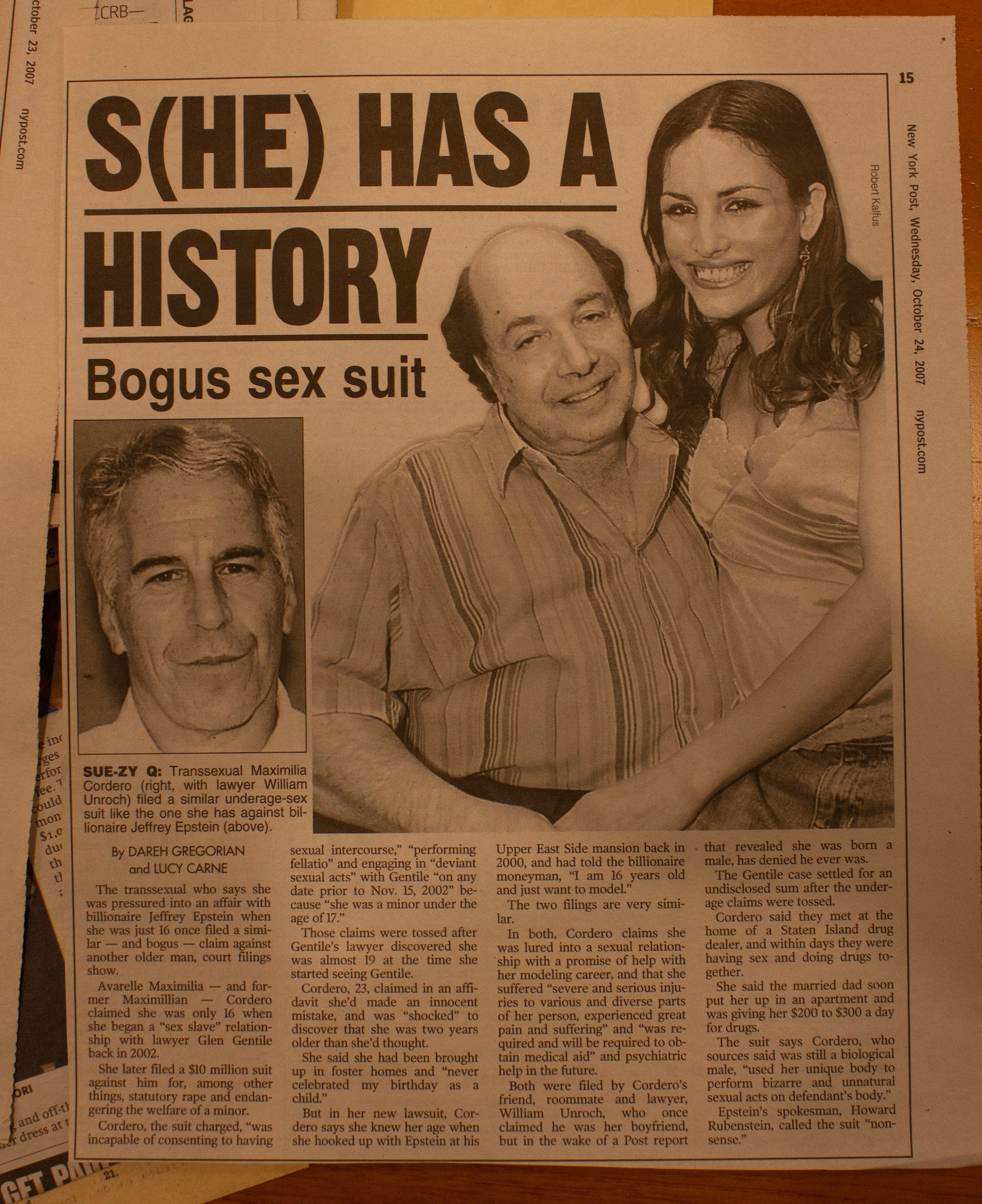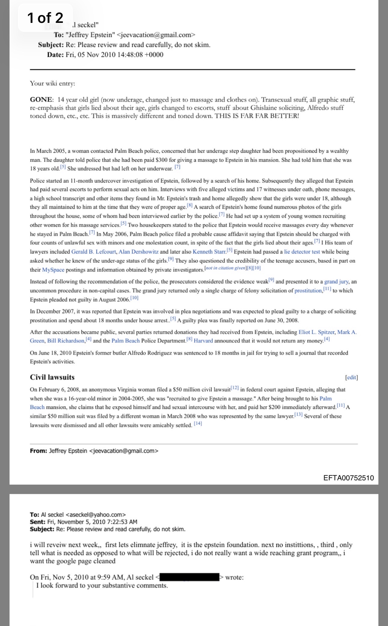 >>42553831Trans girl comes out in 2007 saying she had been abused and enticed to bring in new victims by Epstein. Also claims he requested to be called Janice and said many Victoria's Secret models were trans. Case settles for hundreds of millions. In October 2007, the New York Post and other news sites run smear articles on her outing her as transgender and attacking her credibility.Al Seckel then tells Epstein in 2010 that mentions of it have been removed from his wiki page.