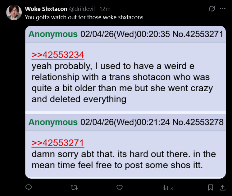 >>42553347most of the other shotacons I've known have been troons or cis women. I think most of the gay pedos have moved onto ftms and femboys desu. rapiest shotacon I knew was that trans girl, and a cis girl who'd always joke about actually doing stuff