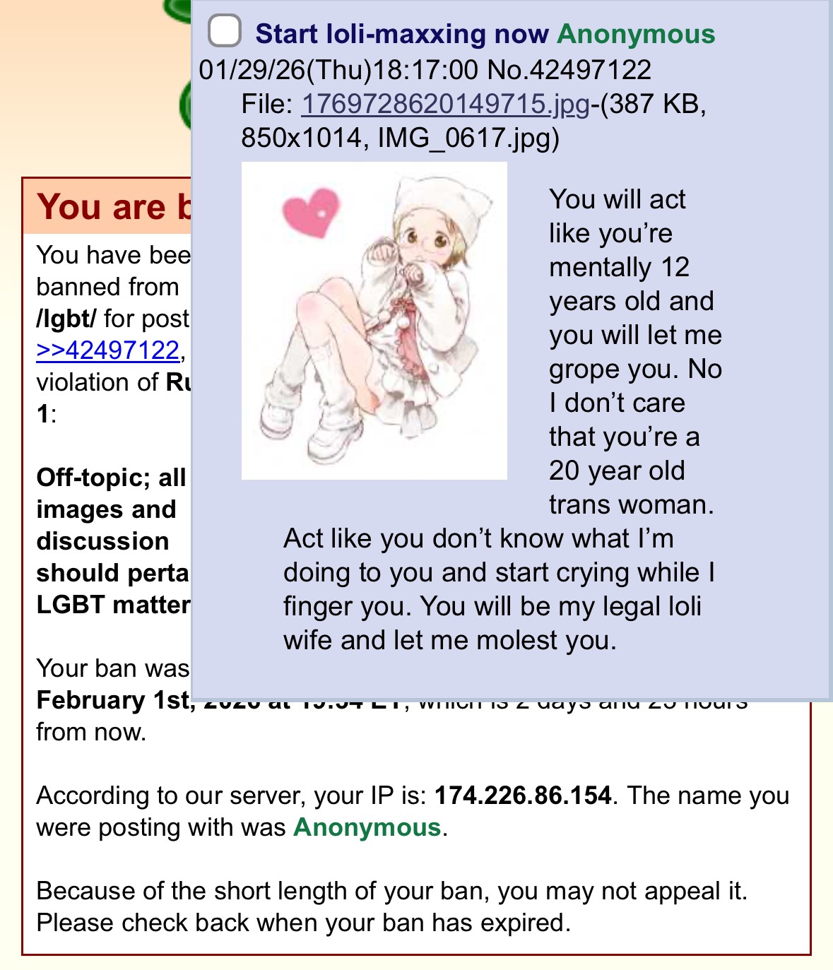 >>42553202This thread including the pedo flag is still up but my ageplay thread got sniped and I got banned for 3 days