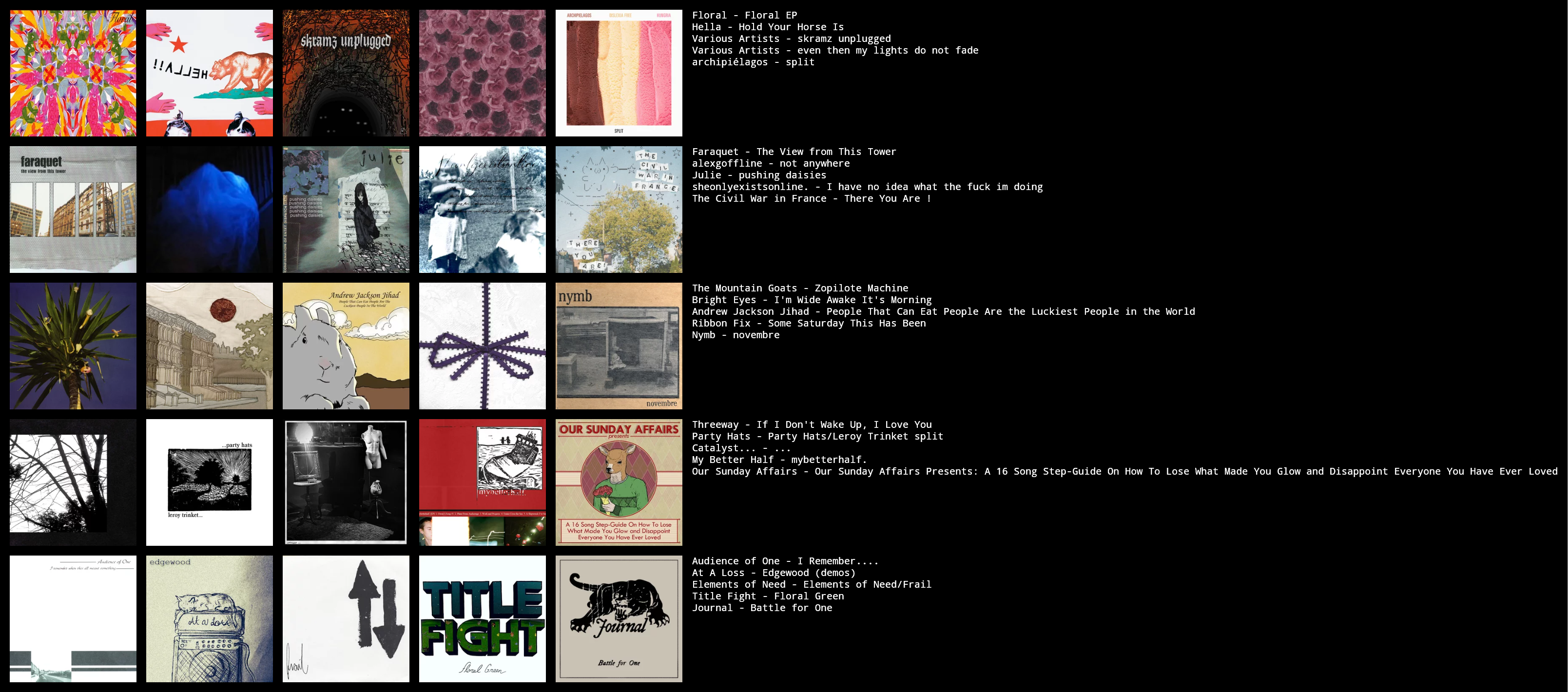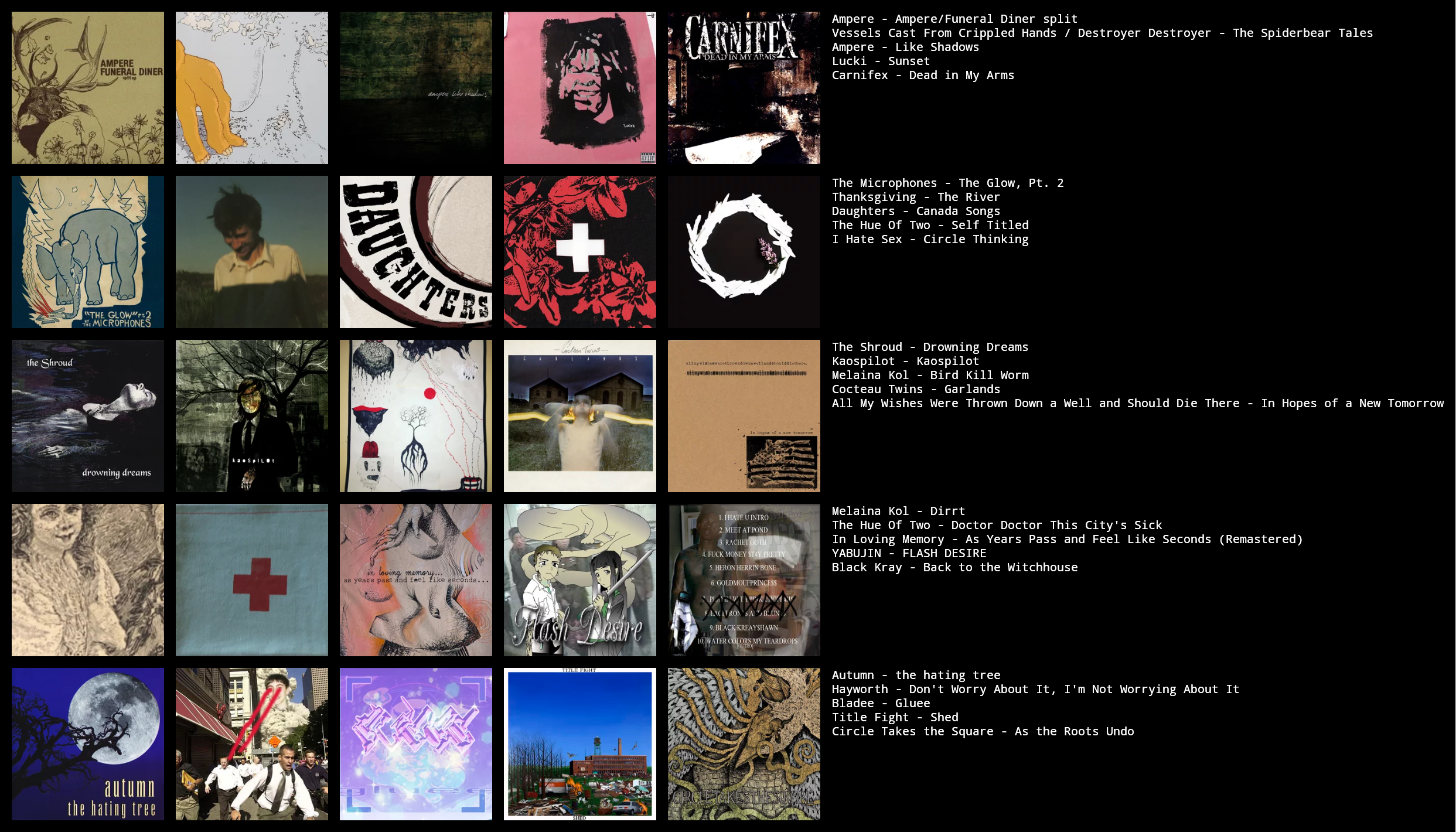 >>42555243++i hate sex, madness, ampere/funeral diner, title fight, all my wishes were thrown down a well and should die+hue of twodon't know others well enough to r8 :/ if anyone can recommend me moar instrumental free-form math rock like hella or floral I'd appreciate it