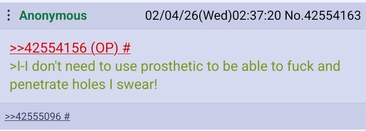 >>42555407I never said they were bad? And my mom told me to never be mean to disabled people.Do you consider strapons to be a prosthetic?