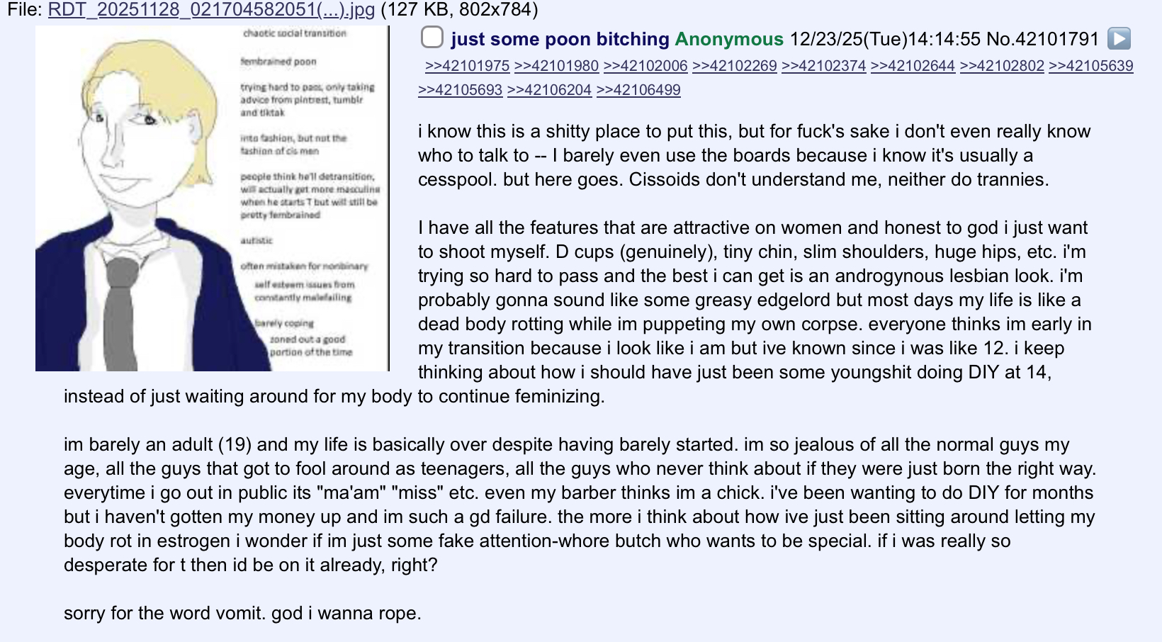 not sure if anyone remembers that thread made like a few days before christmas about some ftm whining that his life was over bc he had boobs (picrel), that was me. since then i locked the hell in, just did my 5th injection last night. been working out every other day too.thanks to everyone who replied on the og thread, even if it was just to call me retarded. it was useful to read someone just say “you won’t pass without hrt” when i’d been seeing all those bullshit ‘how to pass pre-t!’ tumblrite “guides”.
