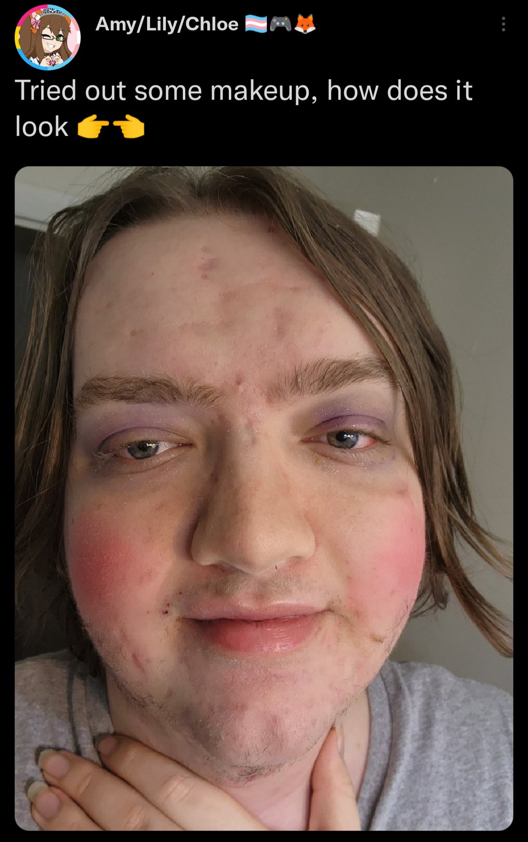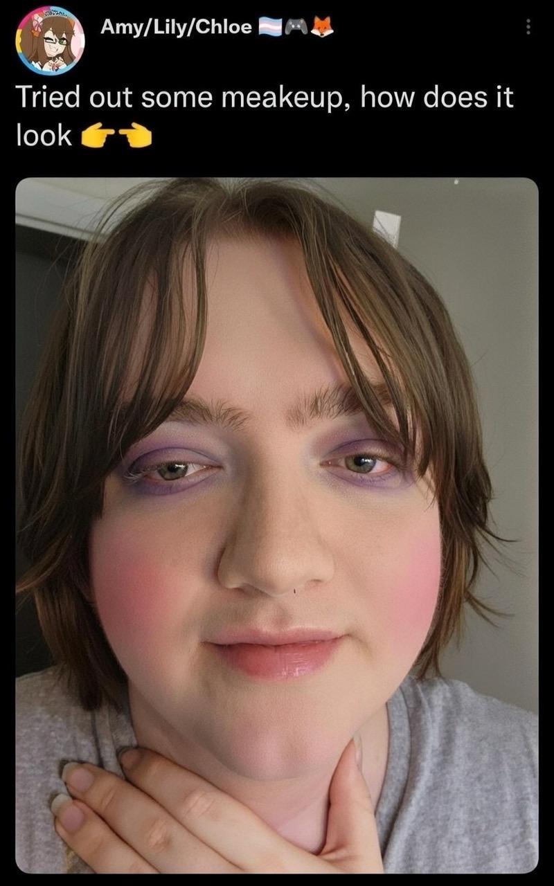 >>42567237it's actually wild to me because her face shape isn't even bad, it's very round and she has full enough lips. she needs to lock in on skincare (and maybe better diet if she's breaking out this bad), get laser or electro and as always eyebrows eyebrows eyebrowsalso is she shaving with a broken razor or something?? it's so patchy and there's like razor cuts on her lip which is also a clear indicator that she hasn't gotten laser or electro yet.>>42569968yeah there's def potential but she needs to lock in and then grow her hair out and see a stylist. how many years on hrt is she on? it looks like she still has psoriasis but it could be something else