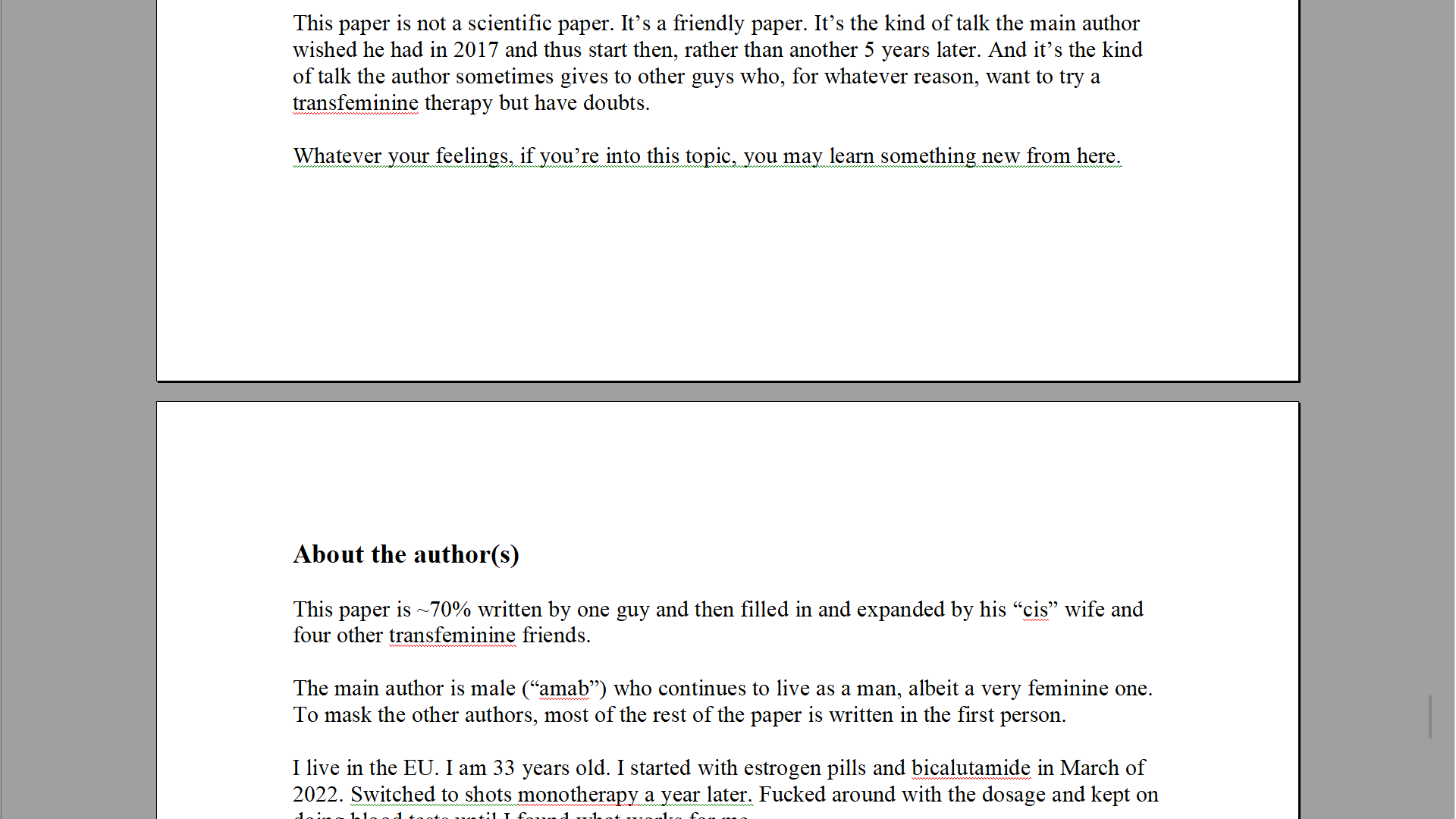 >"AMAB" faggot (obviously)>Find it easier to socialize with women honestly>Have been on estrogen for a span of 2 years before, liked it>Don't really feel dysphoria either way>Only detransitioned because "trutrans" types made me feel insecure>Find straight men hotter than most gay guys I've met>I'm completely fine being the "woman" in the relationship or whatever, honestly love it when guys treat me extremely femininely>Highkey AAP tho, could probably jerk off to myself if I cut my hair shorter and worked out, and I feel attached to the status I feel I have going into an increasingly female-dominated career as a man