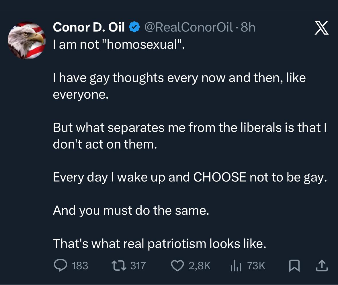 >>42575317it is morally superior tho, no one commends pedos or rapists for acting on their desires, why should gays be any different