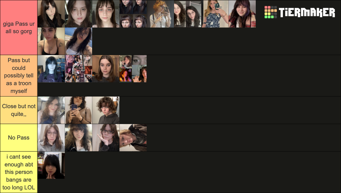 >>42580617who is that person? 3rd from the highest tier. they look like a person on tiktok, but I know the tiktok person is a cis southern girl.