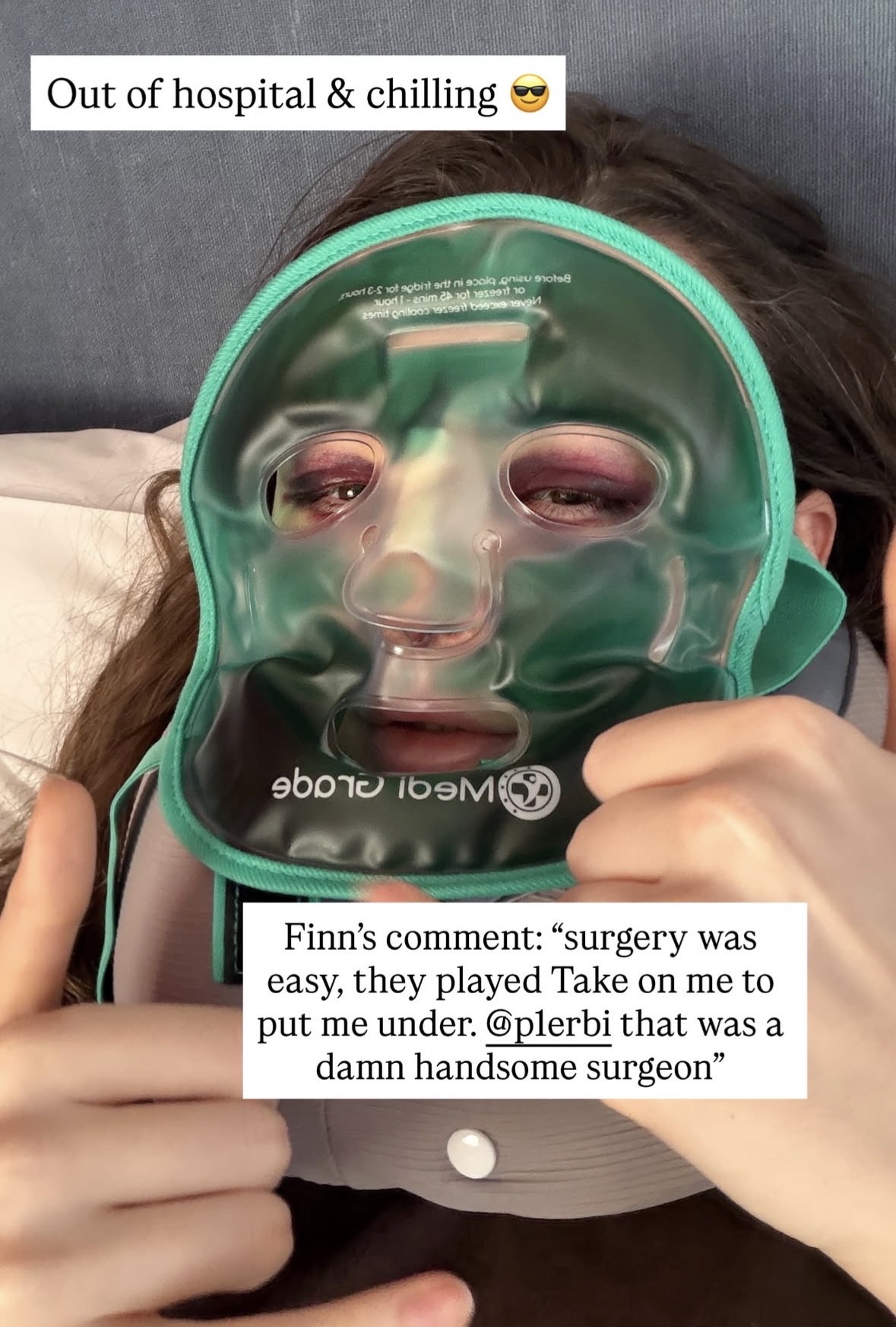 Why is he using a cold pack. Those are bad for surgery recovery because cold slows the flow of blood which is what reduces swelling. All you need is some tylenol and thug that shit out, it's not that bad. First 3 days suck and then it's mostly fine.