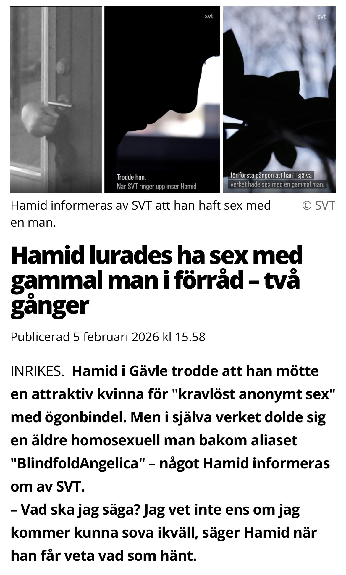 "Hamid was tricked into having sex with old man in storage unit - twicedomestic(aka domestic news) Hamid in Gävle thought that he was meeting an attractive woman for "unconditional anonymous sex" with a blindfold. But in actuality there was an elderly homosexual man behind the alias of 'BlindfoldAngelica' - something which Hamid was informed about by SVT.What am I supposed to say? I don't even know if I'll be able to sleep tonight, says Hamid when he is told about what has happened."